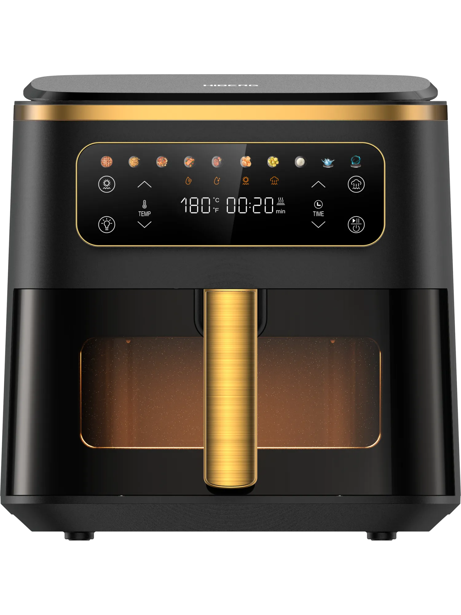 Электрический аэрогриль выполнен в стильном черном цвете с золотом. Большое прозрачное окно и внутреннее LED-подсветка чаши дают возможность наблюдать за процессом готовки без остановки программы.