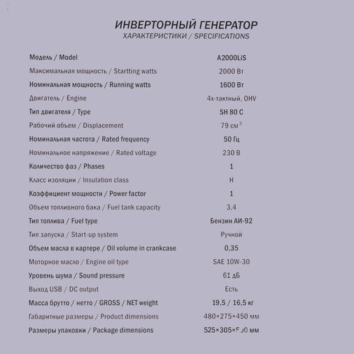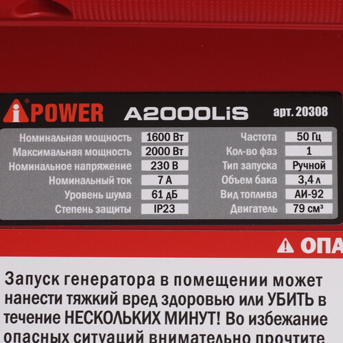 Бензиновый инверторный генератор A-iPower A2000LIS – легкий и компактный аппарат для обеспечения электричеством палаточного лагеря, дачи или небольшой вечеринки. Устройство позволяет подключать несколько потребителей общей мощностью до 2 кВт, в том числе, чувствительную к качеству тока электронику. Ключевые особенности Небольшой размер и вес. Легкий старт. Малый расход топлива. Тихая работа. Возможно параллельное подключение. A-iPower A2000LIS в работе Инверторный генератор обеспечивает стабильно высокое качество напряжения и тока. Ток в форме чистой синусоиды позволяет подключать к портативной электростанции любое чувствительное оборудование без риска его поломки. Запуск осуществляется ручным стартером. Для подключения потребителей предусмотрена бытовая розетка 220 В, выход 12 В для маломощных устройств и порт USB для зарядки гаджетов. На каждую розетку установлены автоматы защиты – в случае перегрузки питание автоматически отключится. Цифровой дисплей на лицевой панели позволяет контролировать напряжение, частоту, количество моточасов в режиме реального времени. Если мощности 2кВт окажется недостаточно – прибор можно подключить в параллельную цепь из нескольких генераторов, тем самым увеличив мощность. Удобный и надежный Генератор A-iPower A2000LIS имеет корпус из прочного пластика с проклеенной шумоизоляцией. Аппарат устойчив к внешним воздействиям и может использоваться на открытом воздухе в любую погоду. Вес агрегата составляет всего 16,5 кг, поэтому его удобно брать с собой на выезды, пикники. Компактные габариты позволяет без труда разместить прибор в багажнике автомобиля. Устройство имеет защиту от низкого уровня масла – при его недостатке двигатель не заведется, а информация о количестве смазки отобразится на дисплее. Низкий расход бензина обеспечивается за счет электронного управления оборотами двигателя.
