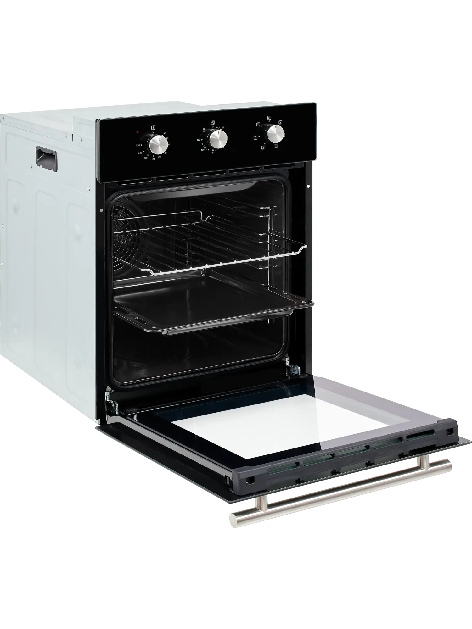 Духовой шкаф с общим объемом 50 л и мощностью 2 кВт, имеет 6 режимов нагрева и механический таймер. Таймер настраивается до 120 минут и контролирует работу духовки на протяжении установленного времени. Духовой шкаф отключается и издает звуковой сигнал по истечению заданного времени готовки.
