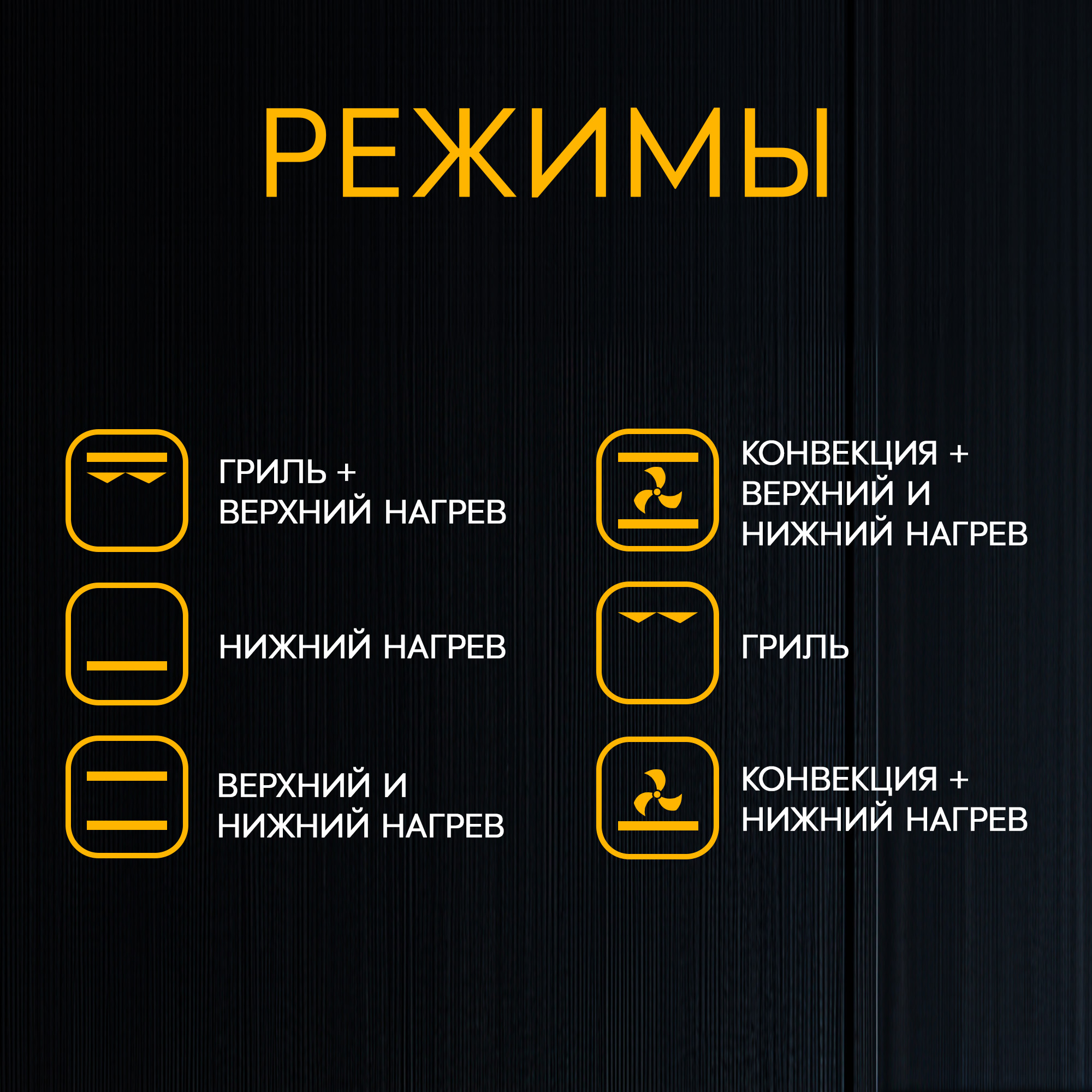 6 режимов работы (нижний нагрев, верхний и нижний нагрев, гриль, гриль + верхний нагрев, конвекция+нижний и верхний нагрев, конвекция + нижний нагрев) покрывают большинство повседневных кулинарных задач. Сенсорный таймер отзывчиво откликается на касания. Объём камеры в 70 литров оптимален для приготовления блюд на семью, а 5 уровней расположения решёток позволяют гибко использовать внутреннее пространство.