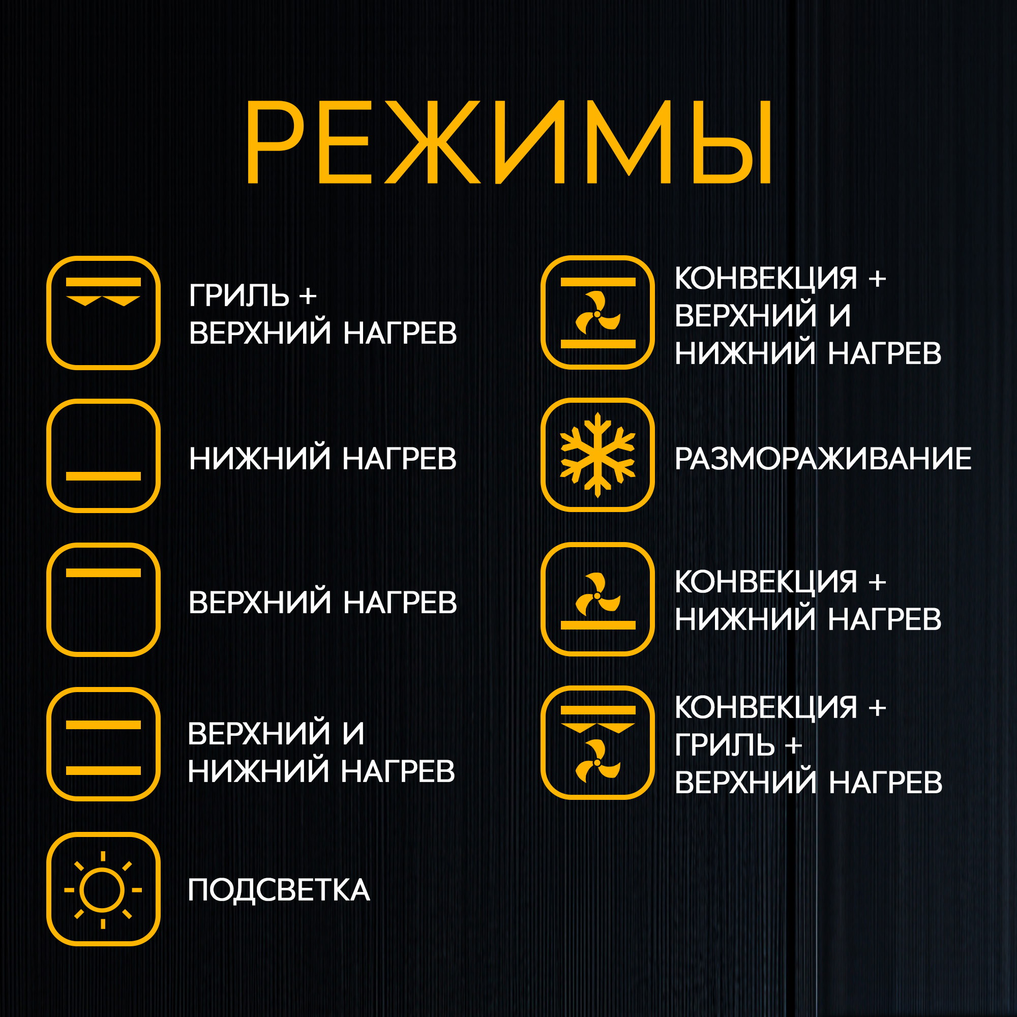 9 режимов работы (размораживание, верхний нагрев, нижний нагрев, верхний и нижний нагрев, гриль + верхний нагрев, конвекция + гриль + верхний нагрев, конвекция + нижний и верхний нагрев, конвекция + нижний нагрев) покрывают широкий спектр кулинарных задач. Сенсорный таймер отзывчиво откликается на касания. Объём камеры в 70 литров оптимален для приготовления блюд на семью, а 5 уровней расположения решёток позволяют гибко использовать внутреннее пространство. Прочные стальные телескопические направляющие обеспечивают плавный и бесшумный ход противней даже при полной загрузке.