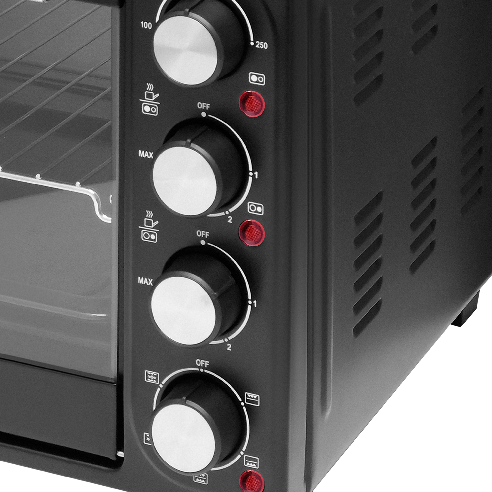 Все элементы у мини-печи выполнены с вниманием к деталям. Механическая панель управления легко настраивается и позволяет сфокусировать своё внимание на готовке, а не на настройке мини-печи. Уход за мини-печью занимает минимум усилий: съёмные противни и стеклянная дверца легко моются. В комплекте есть всё необходимое для начала приготовления пищи без покупки дополнительной посуды.