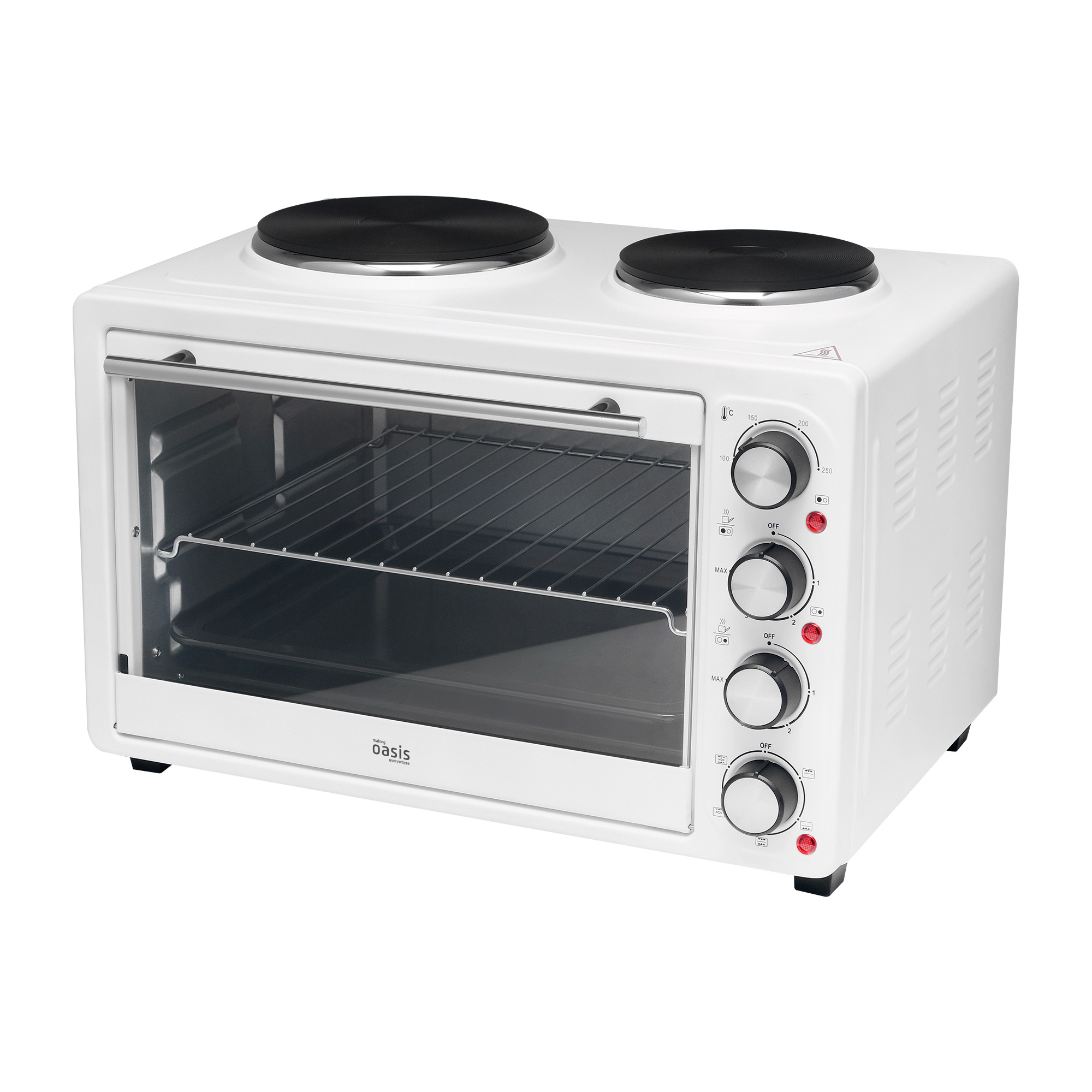 Электрическая мини-печь making Oasis everywhere со встроенными конфорками — это универсальное решение, которое способно заменить сразу духовой шкаф и варочную панель. Устройство актуально в условиях небольшого помещения, например дома без кухни, где нет возможности установить два кухонных прибора, но при этом не хочется ограничивать себя в приготовлении блюд. Функция конвекции обеспечивает равномерную циркуляцию горячего воздуха, благодаря чему блюда пропекаются идеально — без подгоревших краёв и сырых середин.