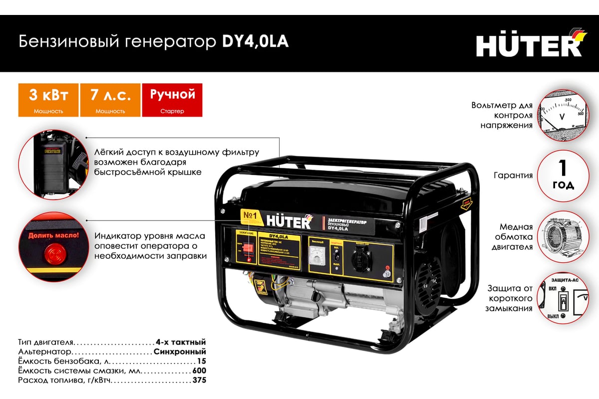 Бензиновая электростанция Huter DY4,0LA оборудована мощным одноцилиндровым четырёхтактным двигателем внутреннего сгорания, мощностью 7 л.с. Запуск производится ручным стартером. Электрогенератор DY4,0LA имеет рабочую мощность 3 кВт, а также все виды защиты – от перегрузки, короткого замыкания и низкого масляного уровня.