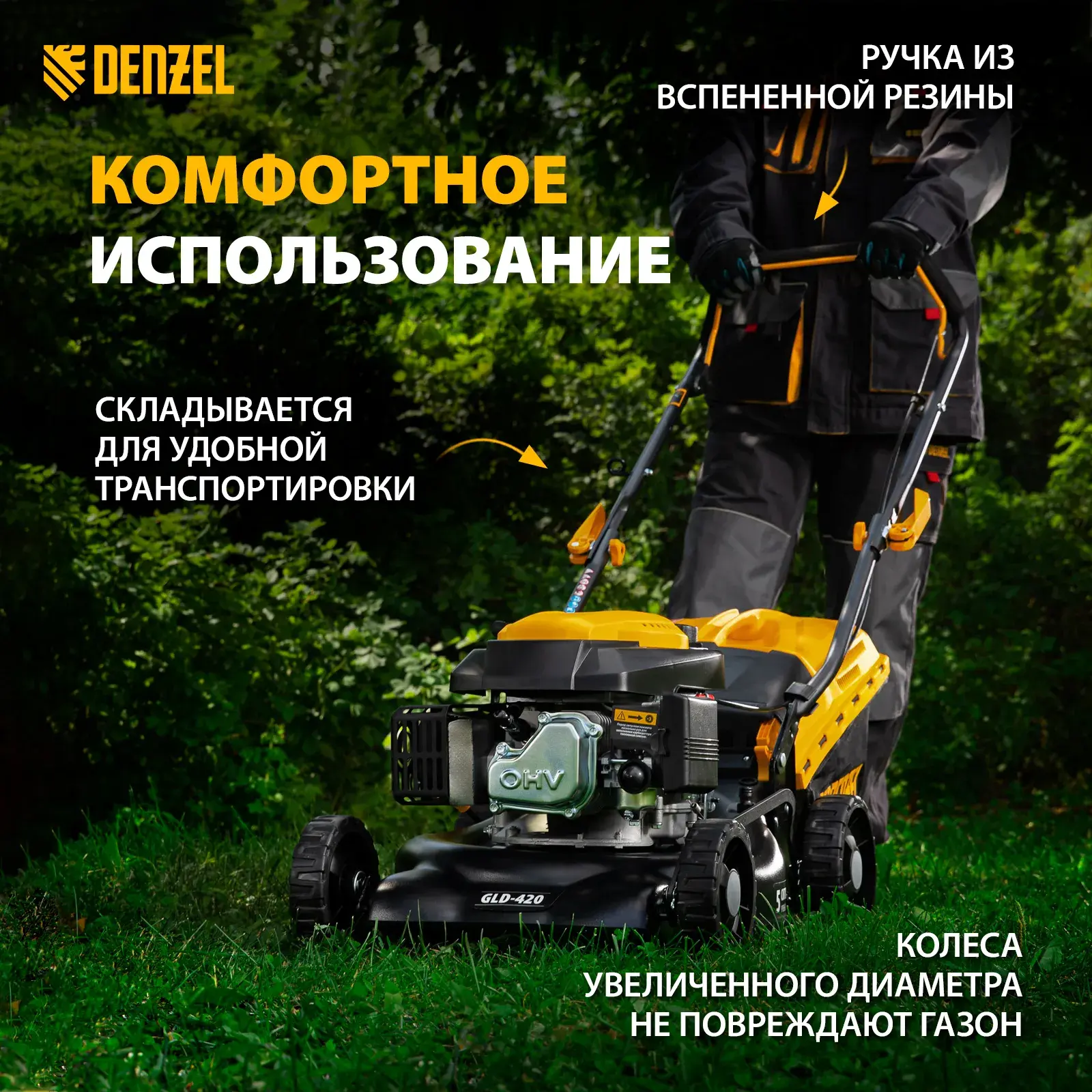 Бензиновая газонокосилка Denzel GLD-420 58805 с объемом двигателя 146 см куб., травосборником на 40 л, с шириной прохода 42 см, идеально подходит для благоустройства дачных территорий, огородов и ровных земельных участков. Ширина скашивания за один проход 42 см позволяет обрабатывать 1500 кв.м за 1 час. В зависимости от нагрузки, дозаправка топливного бака требуется через 40-60 минут. Мощность двигателя данной модели составляет 4,5 л.с.;Для создания идеальной дорожки, площадки для спортивных игр или другого типа покрова в газонокосилке предусмотрено 5 уровней скашивания. Поворачивая рычаг регулировки высоты покоса, Вы сможете самостоятельно выбрать желаемое значение в диапазоне 25-75 мм. Косилка способна срезать даже густую траву и стебли, потому что оснащена закаленным до твердости 45 HRC ножом.