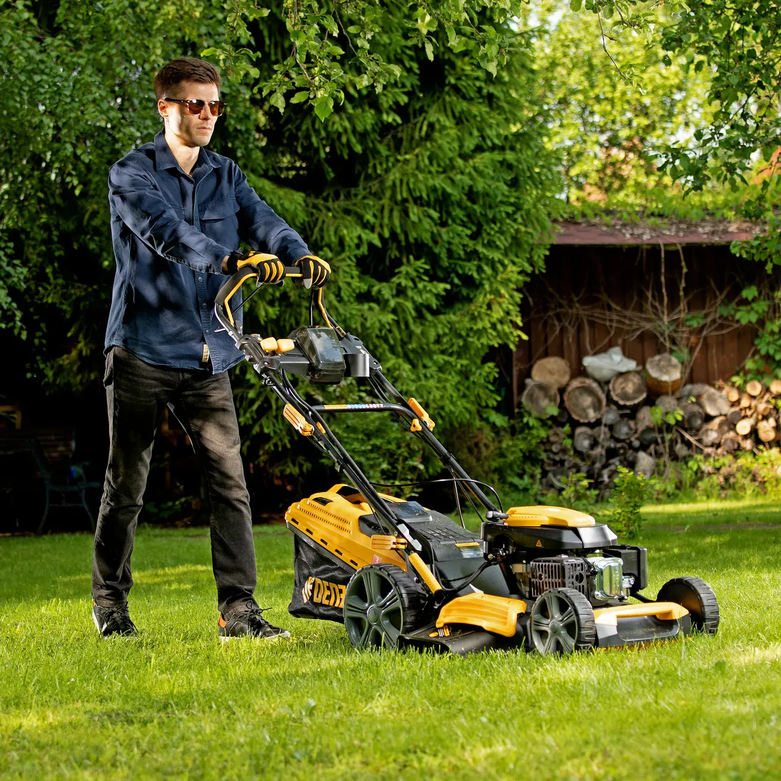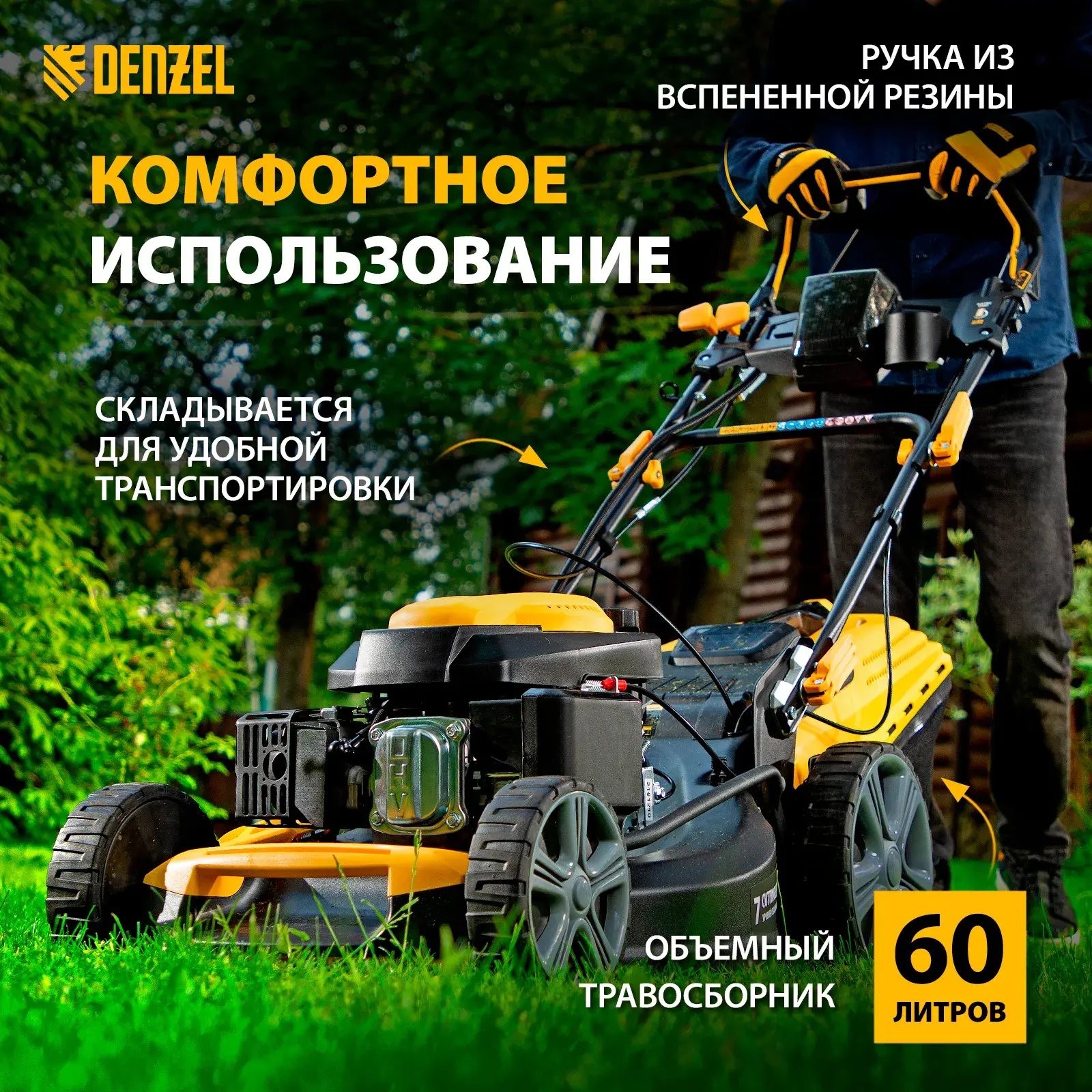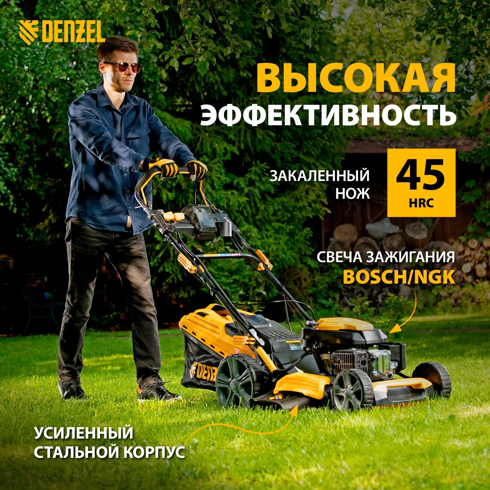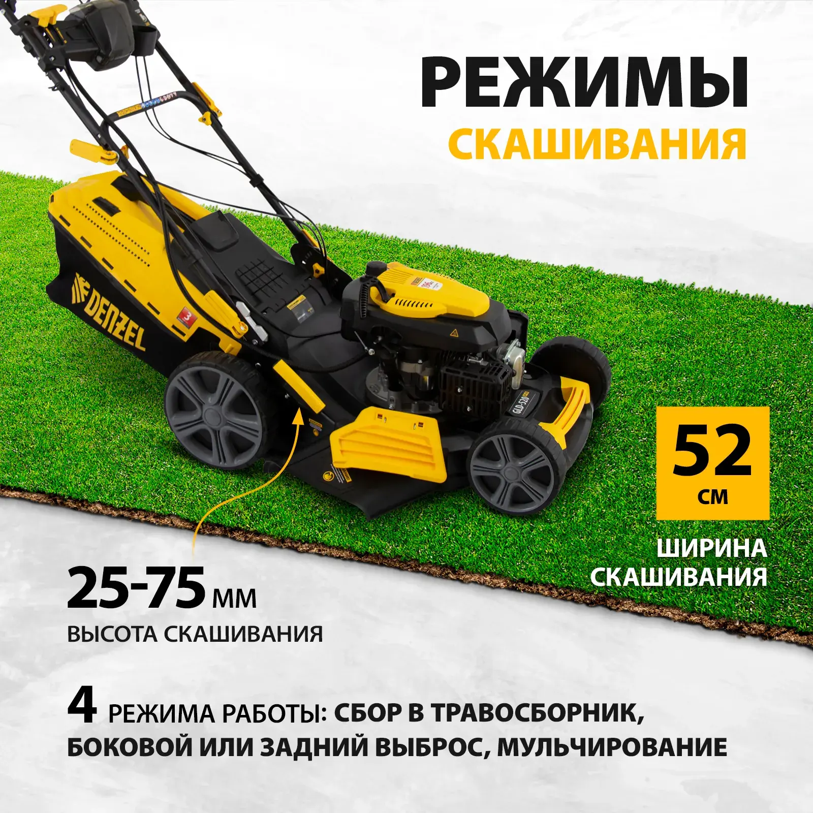 Бензиновая газонокосилка Denzel GLD-520SP-VE 58806 с приводом на колеса и вариатором оснащена двигателем объемом 196 см3 и электрическим стартом. Обеспечивает ширину скашивания 52 см за один проход и собирает траву в контейнер объемом 60 л. Идеально подходит для благоустройства дачной территории, обновления газонов и дорожек. Благодаря двигателю мощностью 6,5 л.с. справляется даже с густым бурьяном.
