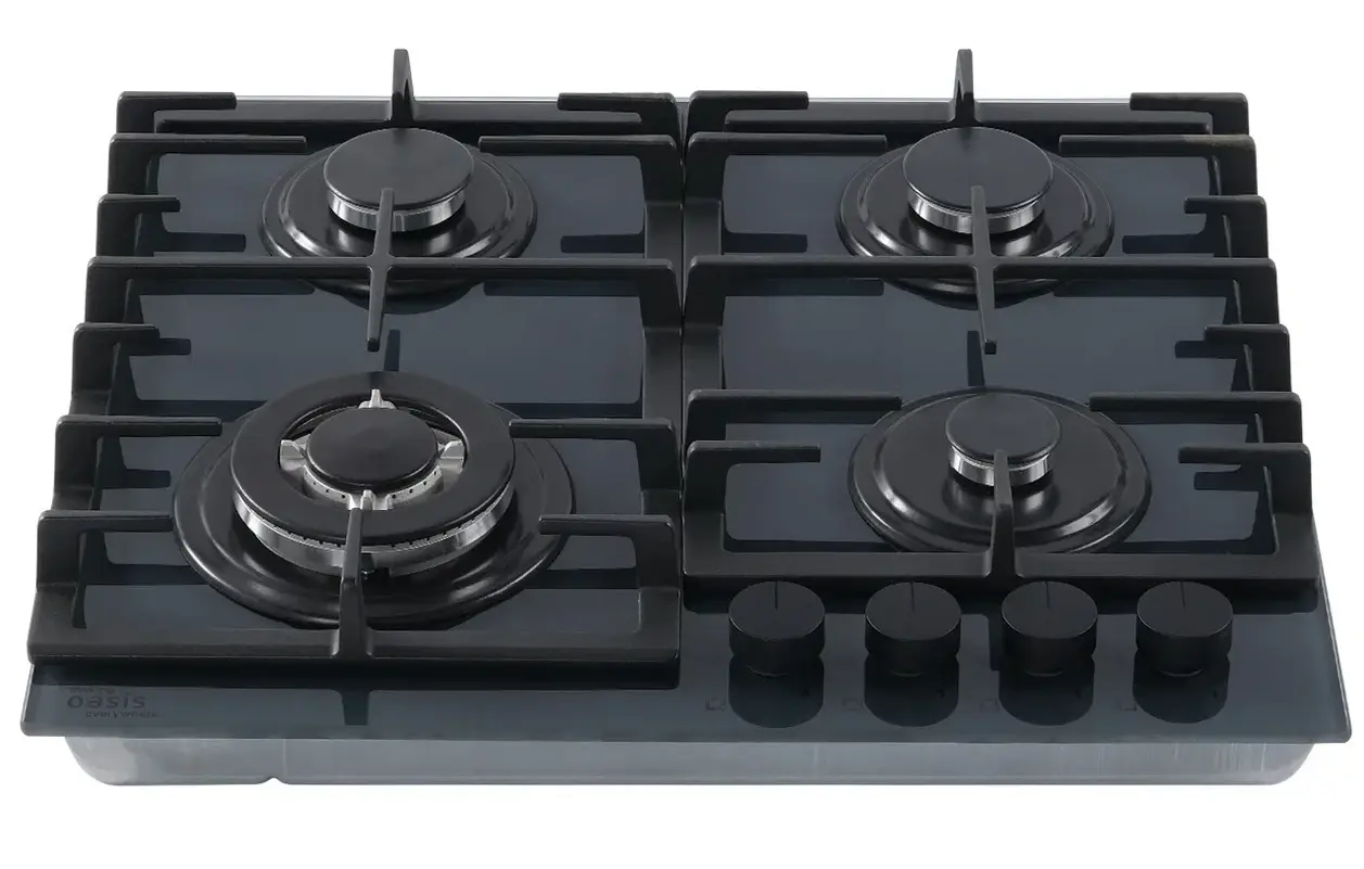 Цвет серый, закаленное стекло, 2 чугунные решетки, автоматический розжиг, газ-контроль, 4 газовые конфорки, WOK-конфорка, ширина варочной поверхности 60см, Турция