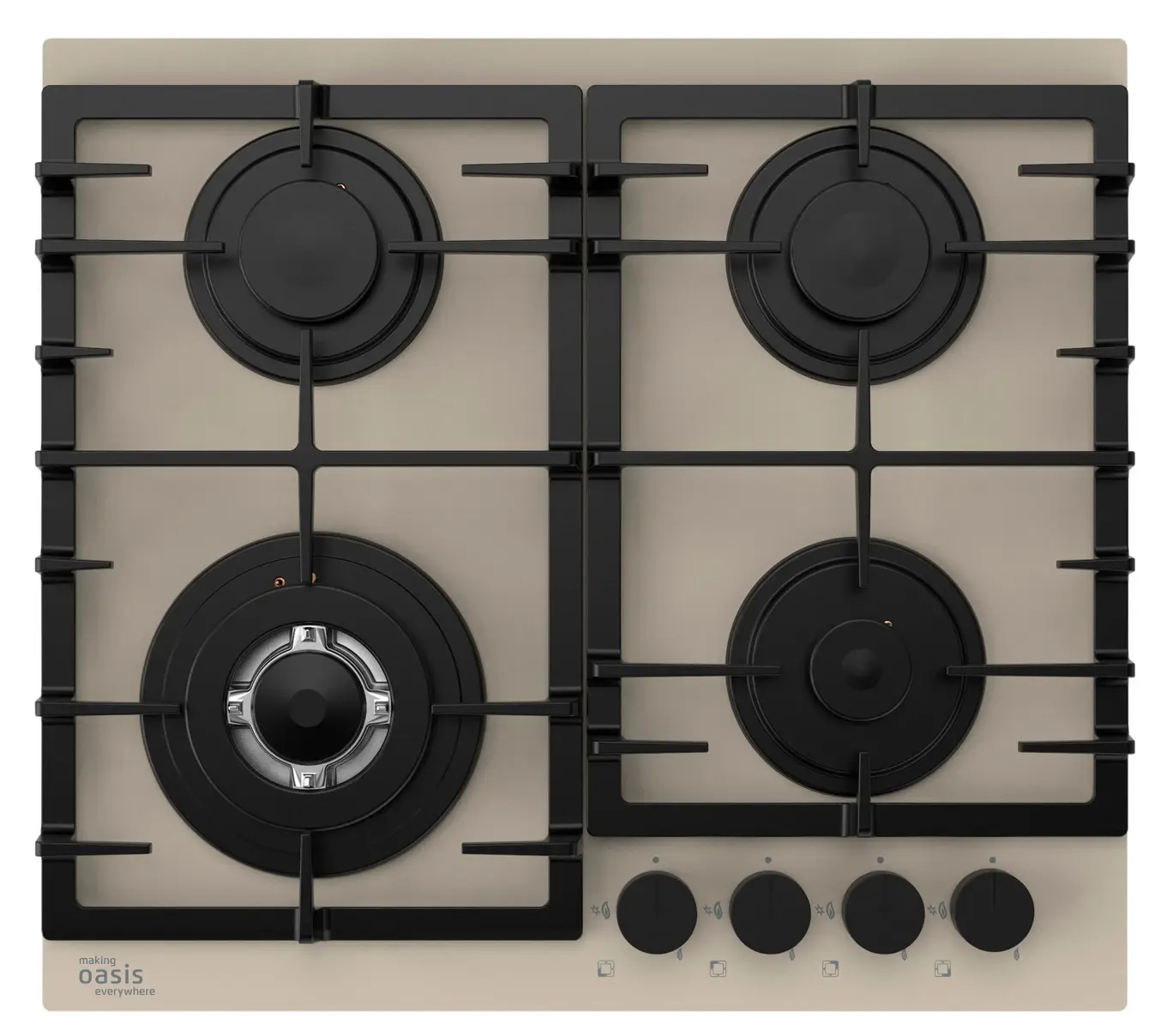 Цвет бежевый, закаленное стекло, 2 чугунные решетки, автоматический розжиг, газ-контроль, 4 газовые конфорки, WOK-конфорка, ширина варочной поверхности 60см, Турция