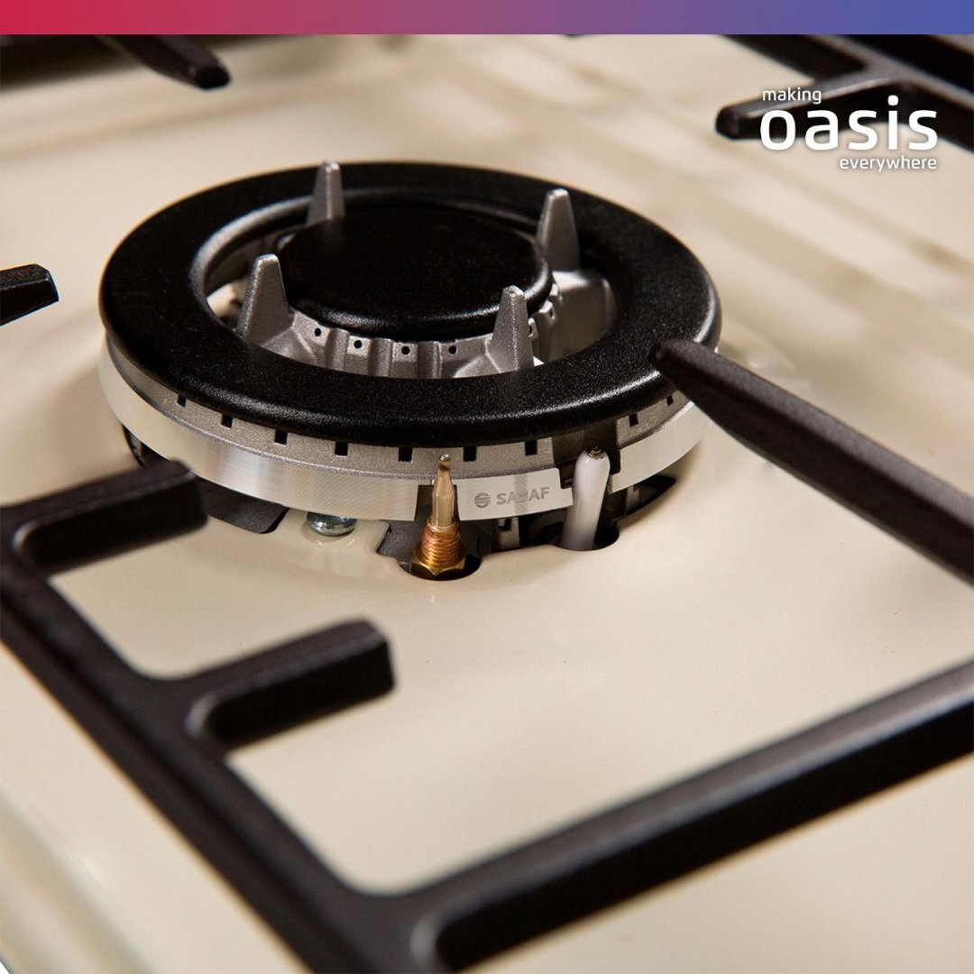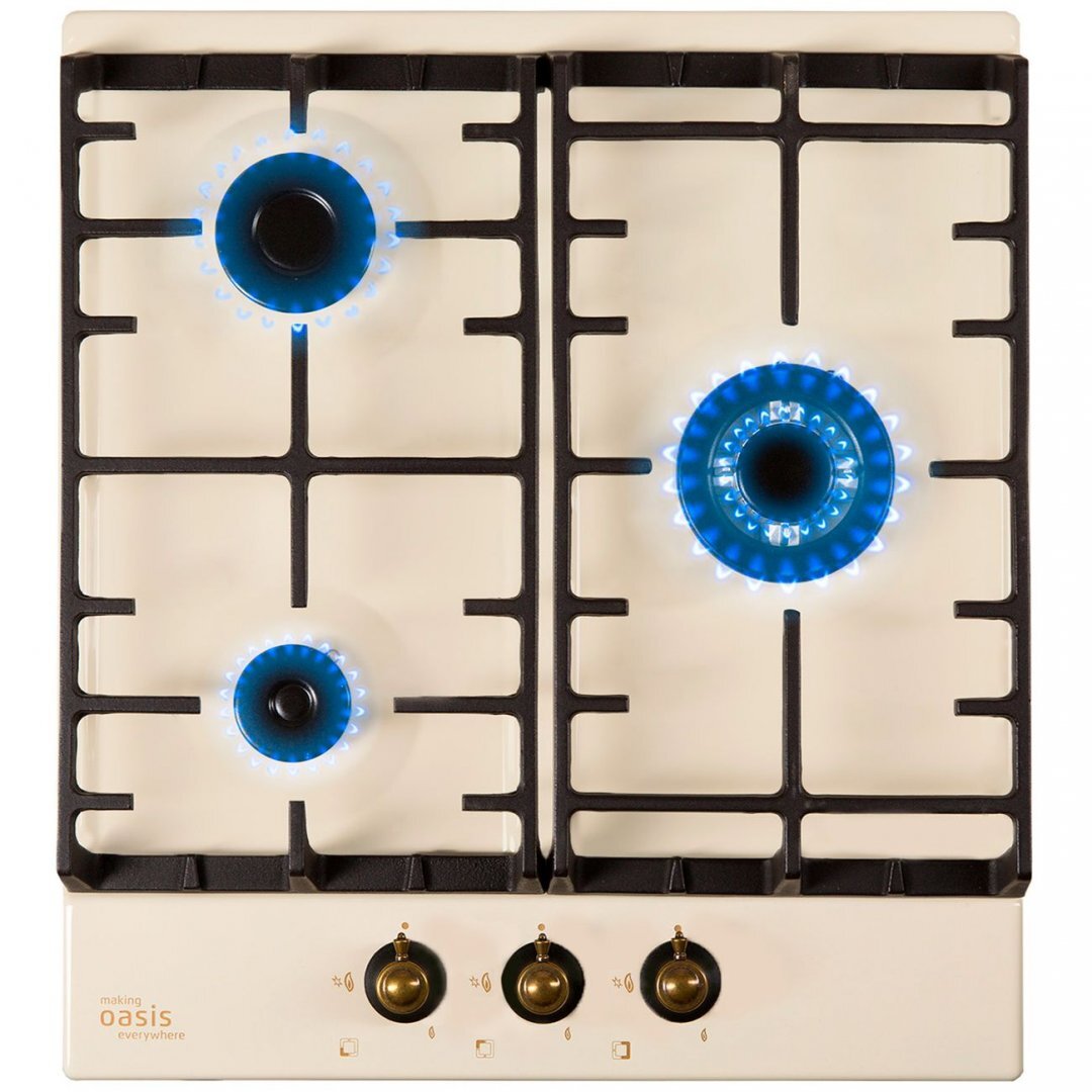 Цвет бежевый, металл, чугунная решетка, автоматический розжиг, газ-контроль, 3 газовые конфорки, WOK-конфорка, ширина варочной поверхности 45см, Турция