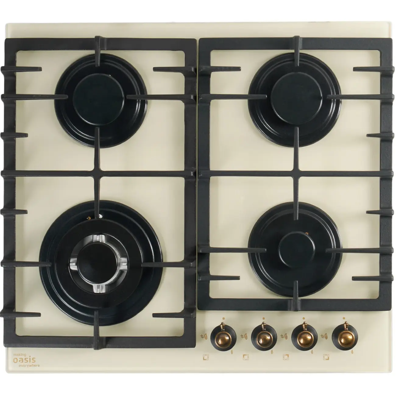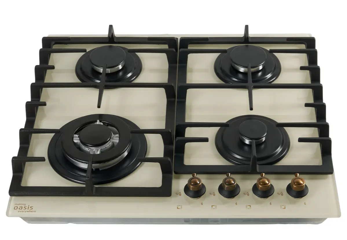 Цвет бежевый, закаленное стекло, чугунные решетки, автоматический розжиг, газ-контроль, 4 газовые конфорки, WOK-конфорка, ширина варочной поверхности 60см, Турция