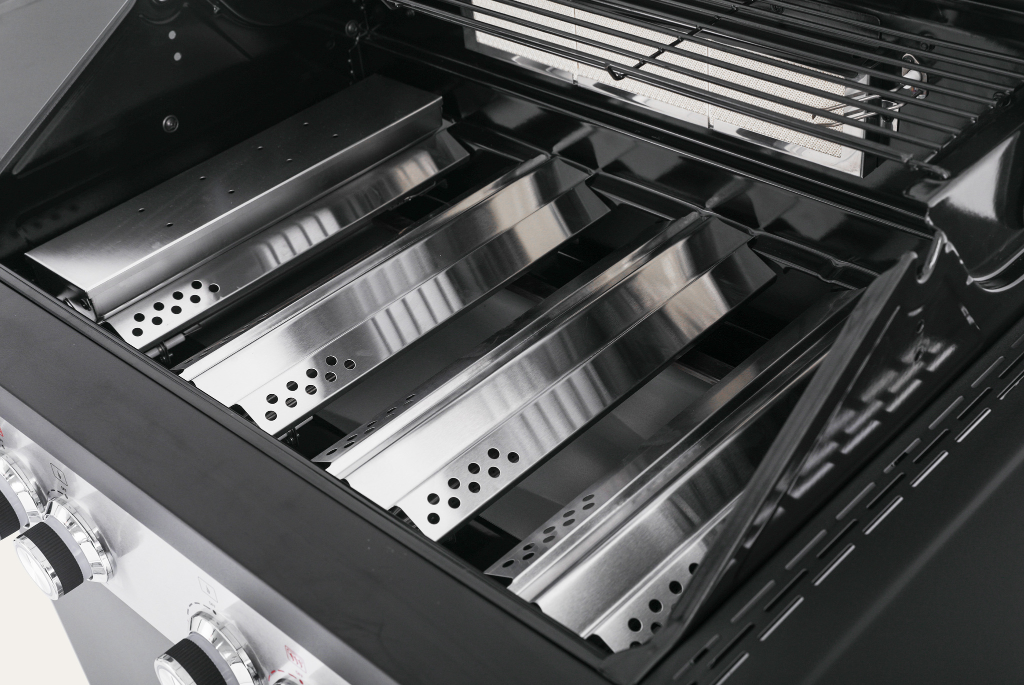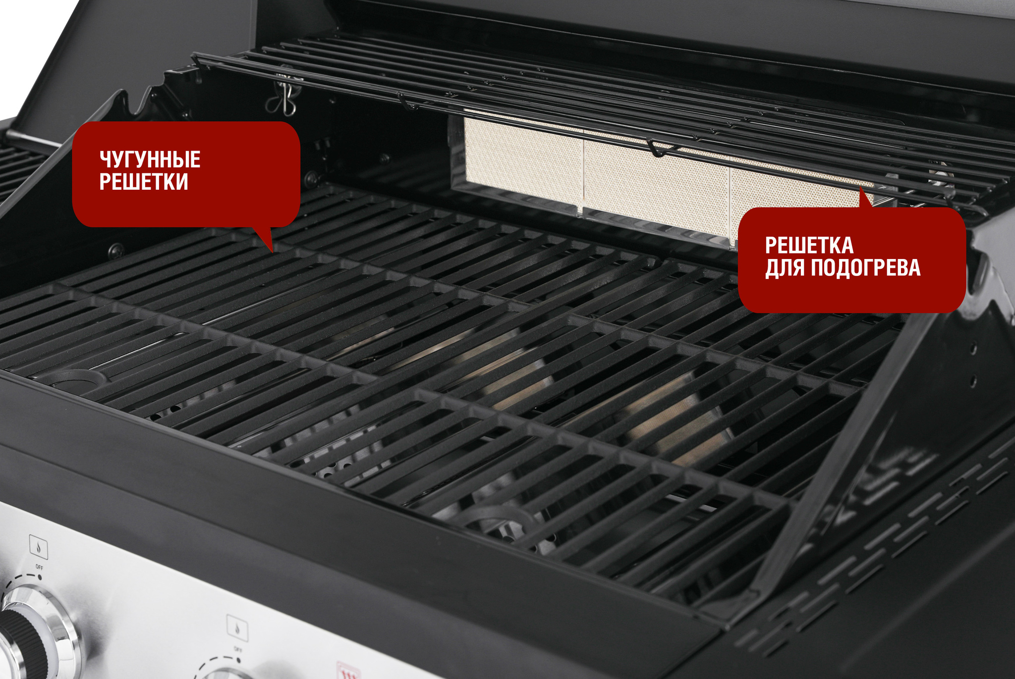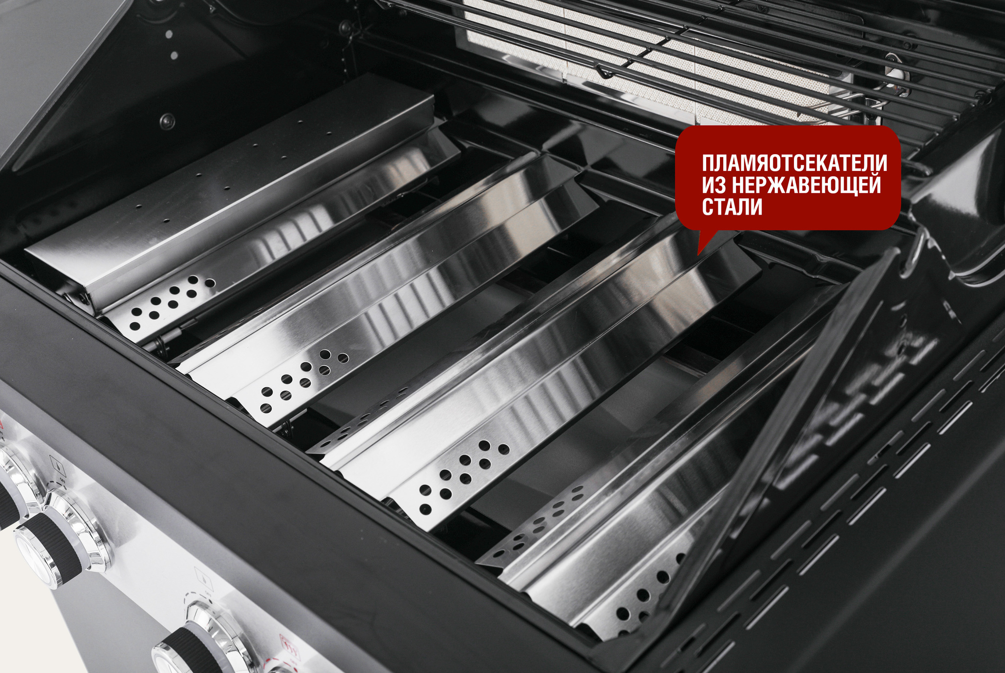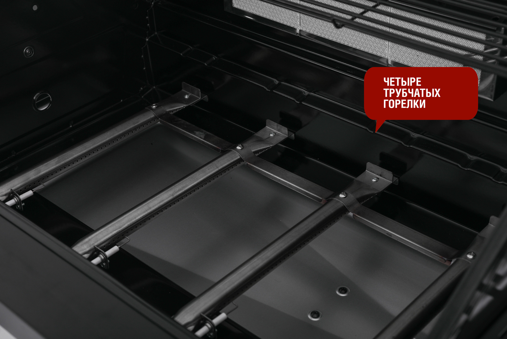 Гриль имеет четыре основные горелки, две дополнительные инфракрасные горелки и большую площадь жарочной поверхности. Это обеспечивает равномерное распределение основного тепла и быстрое нагревание инфракрасной горелки до 800°C для экспресс-обжарки мяса.