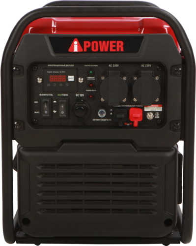 На панели управления генератора выведены 2 стандартные розетки 220В, одна розетка под прикуриватель 12В и USB выход. Многофункциональный дисплей отображает основные параметры работы генератора.