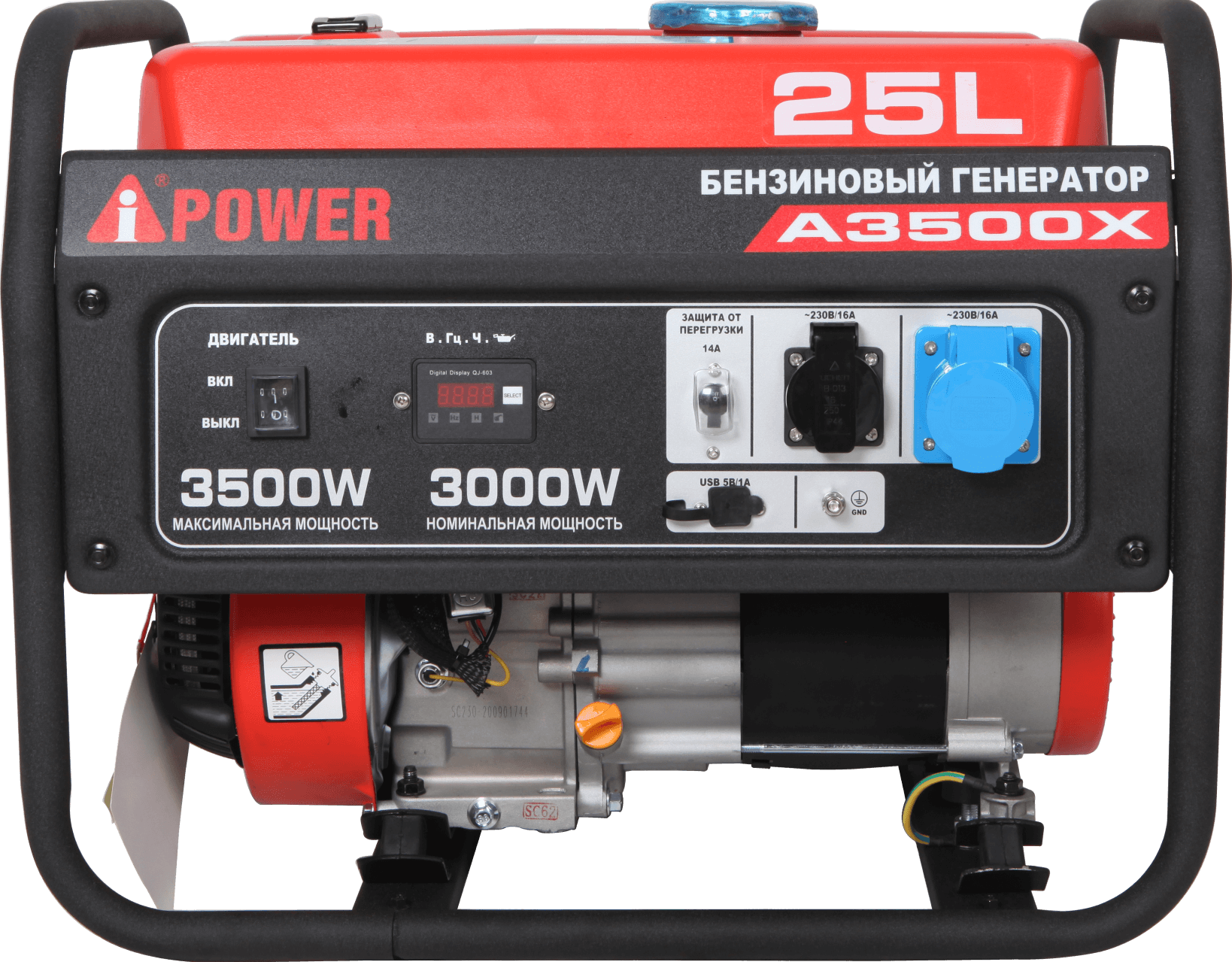 A-iPower A3500X оснащен компактным гильзованным 4-тактный OHV-двигателем объемом 223 куб. см с ручным стартером. На панели управления находится одна стандартная розетка 230В/16А, одна силовая розетка 230В/16А, и разъем USB, от которого можно подзарядить смартфон, планшет и другие гаджеты. На цифровой дисплей в режиме реального времени выводятся сведения о работе генератора.