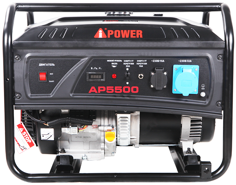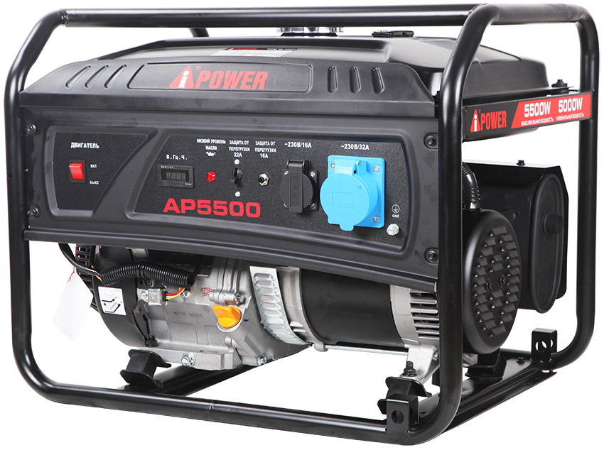 Бензиновый генератор A-iPower AP5500 станет Вашим надежным источником питания при отсутствии электроэнергии. Этот генератор с максимальной мощностью 5500 Вт и номинальной мощностью 5000 Вт работает до 6,9 часов при 100% нагрузке! A-iPower AP5500 оснащен компактным гильзованным 4-тактный OHV-двигателем объемом 389 куб. см с ручным стартером. На панели управления находится одна стандартная розетка 230В/16А и одна силовая розетка 230В/32А. Все розетки закрыты пластиковыми крышками что защищает их от суровых погодных условий при использовании на улице. На цифровой дисплей в режиме реального времени выводятся сведения о работе генератора. A-iPower AP5500 оснащен автоматами защиты которые при перегрузке предотвратят выход из строя и остановят генератор. Также система защиты предотвратит запуск двигателя при снижении уровня масла. А от внешних повреждений защитит мощная рама. На генератор A-iPower AP5500 распространяется 2-х летняя расширенная гарантия при регистрации на сайте производителя. A-iPower – это американское качество и высочайшая надёжность.