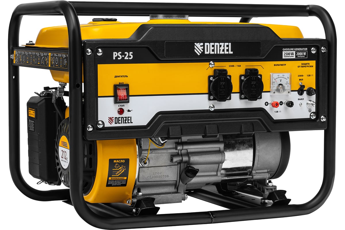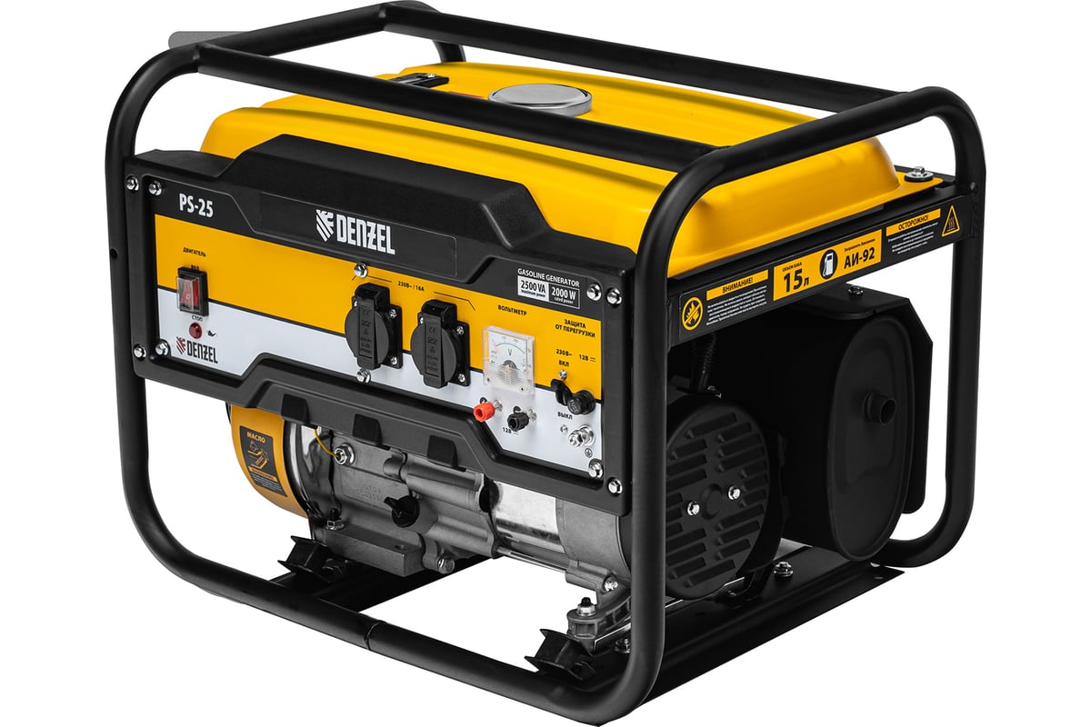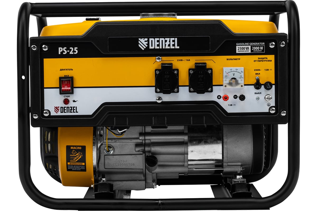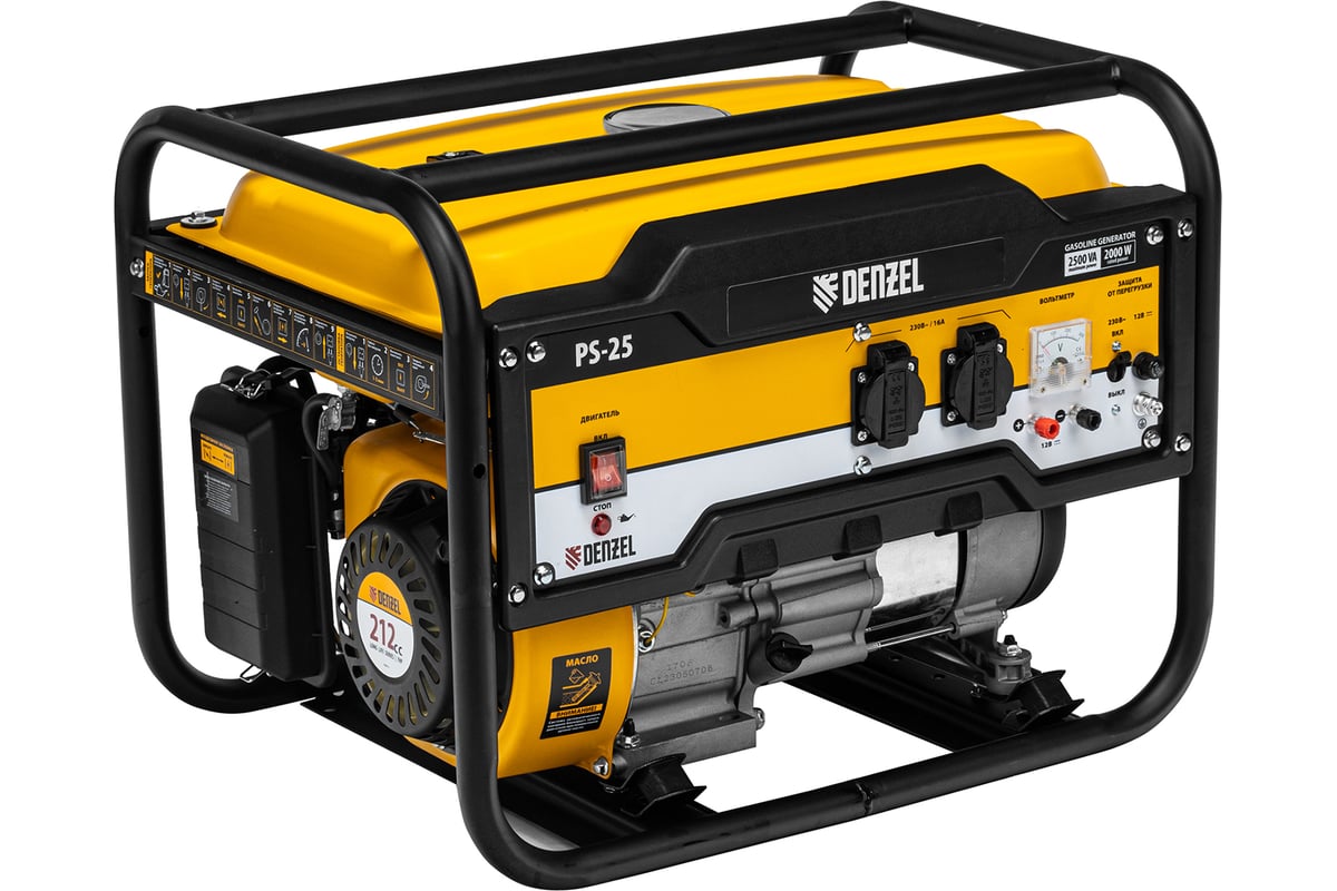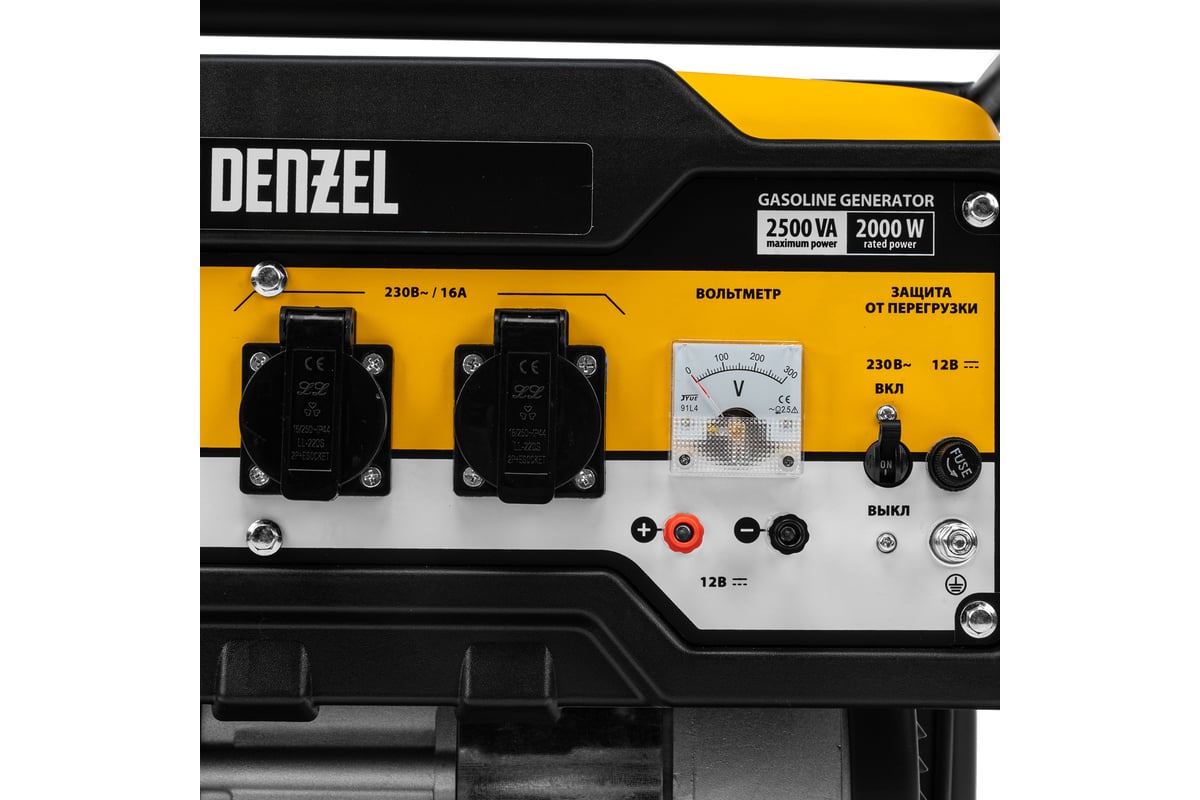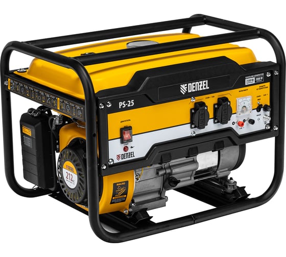 - Бензиновый генератор DENZEL PS 25, 2,5 кВт, 230В, 15л, ручной стартер 946814 оснащен вольтметром для контроля за напряжением.