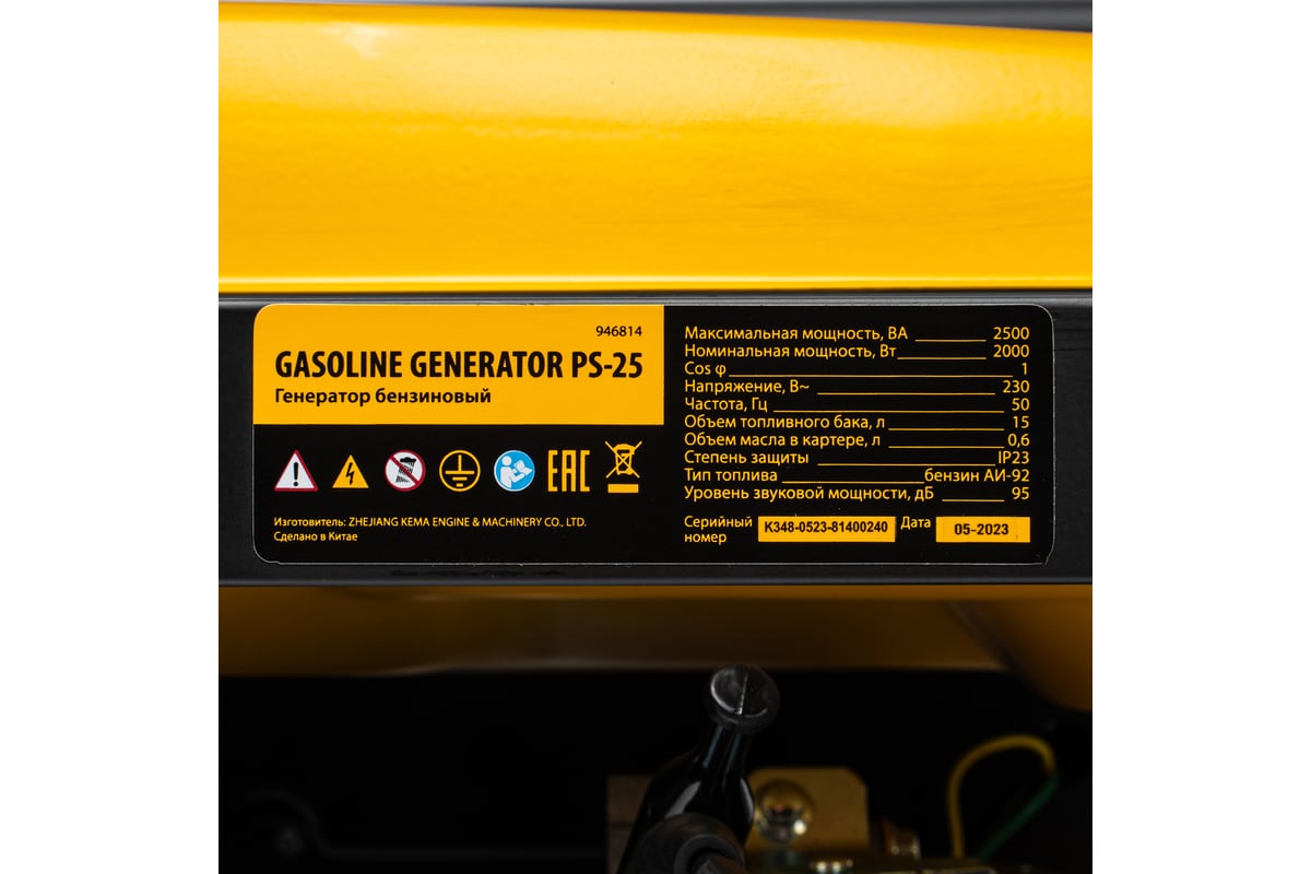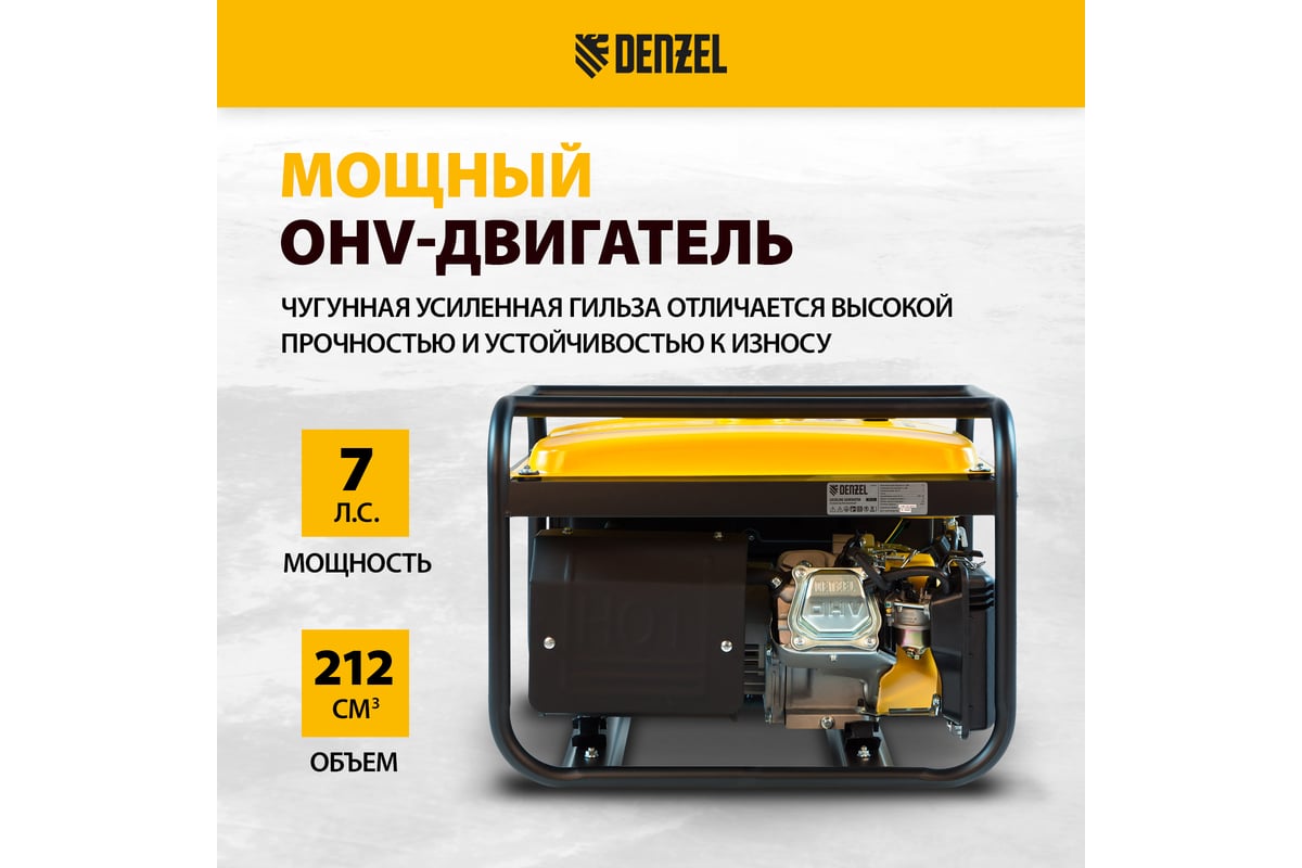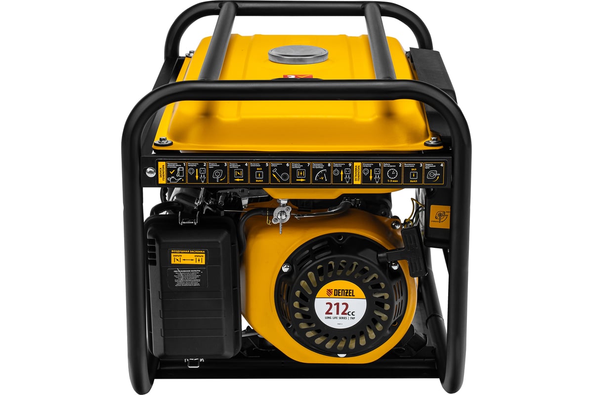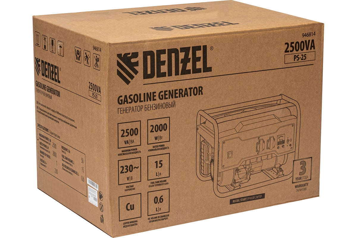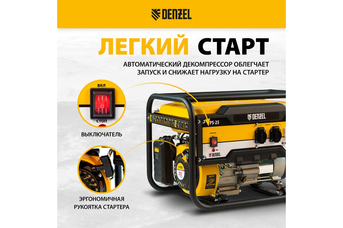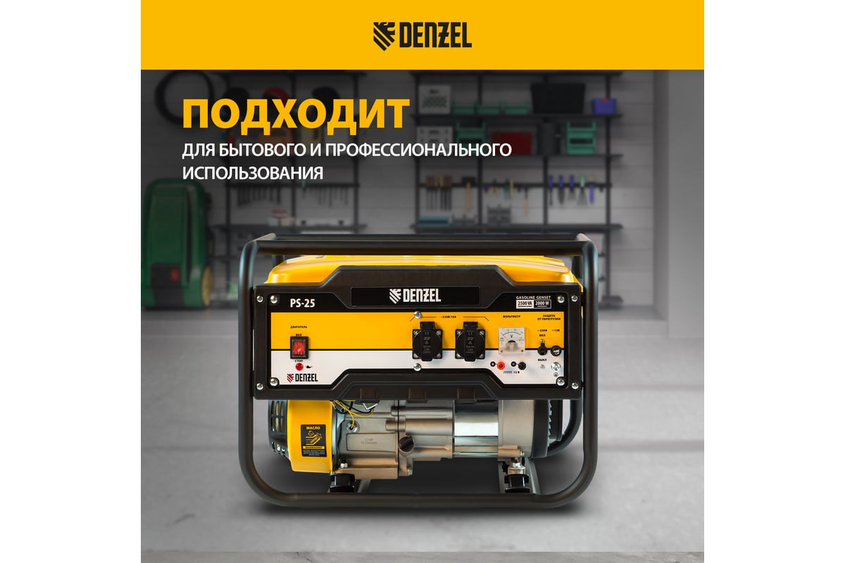 - Бензиновый генератор DENZEL PS 25, 2,5 кВт, 230В, 15л, ручной стартер 946814 оснащен вольтметром для контроля за напряжением.