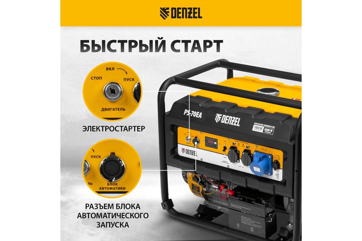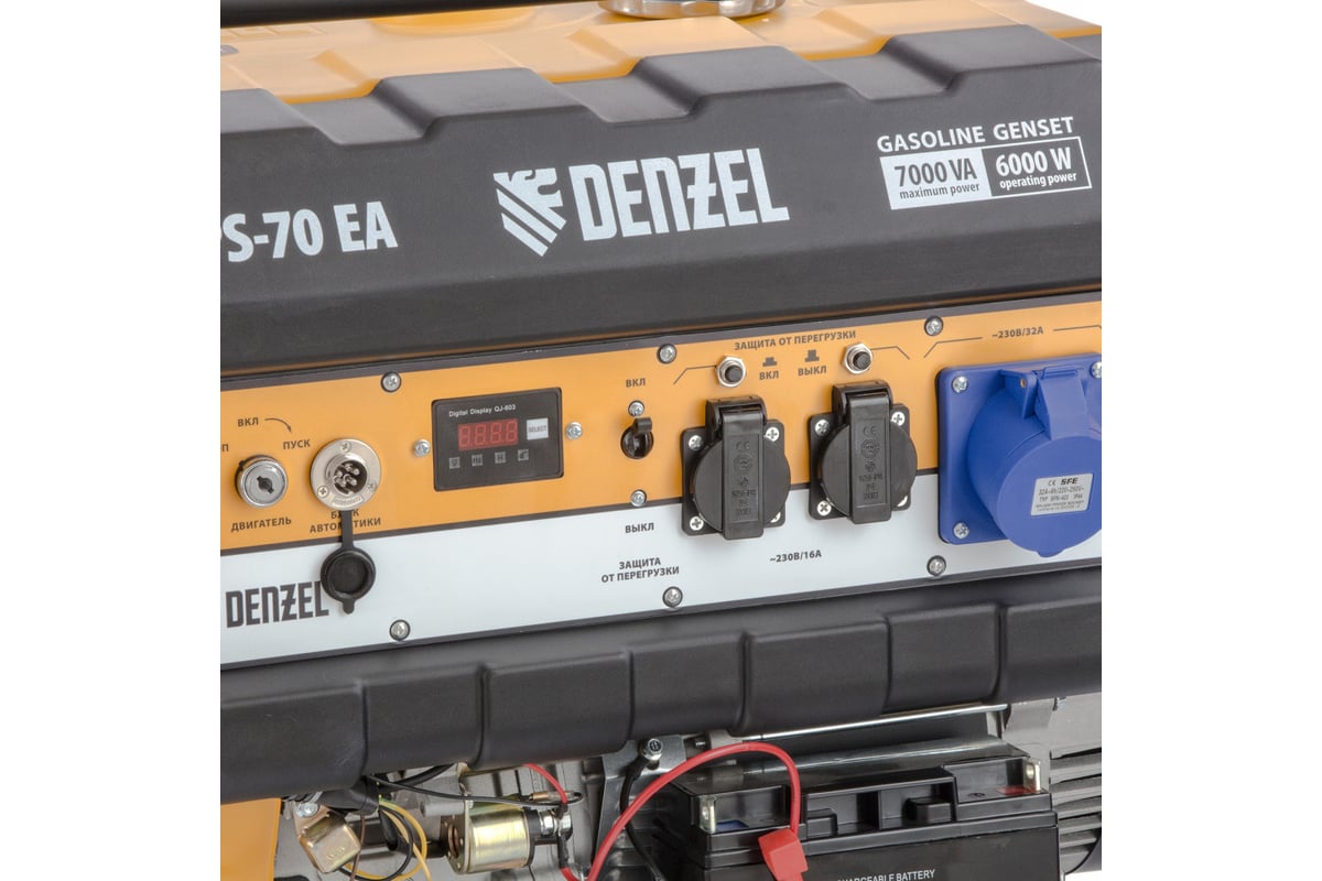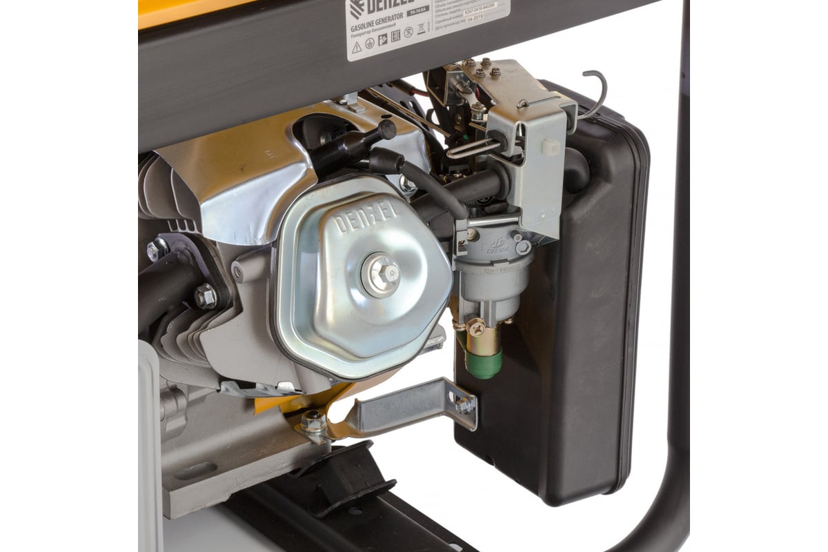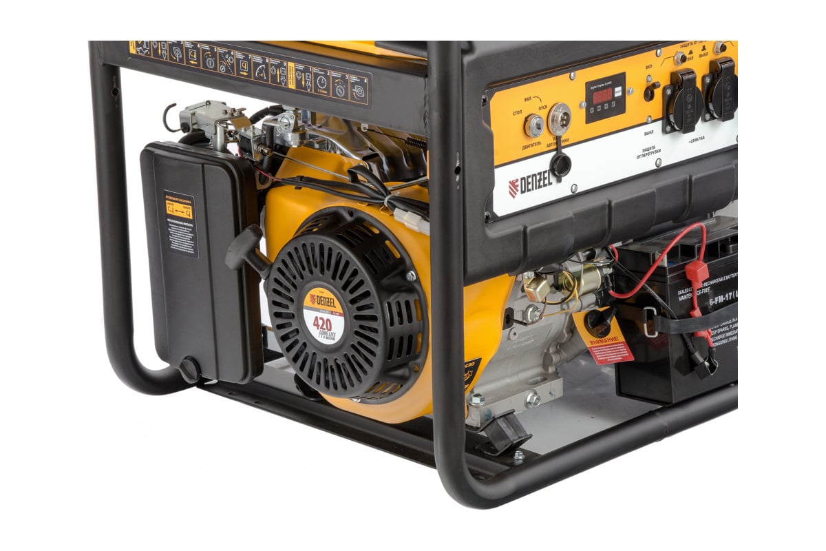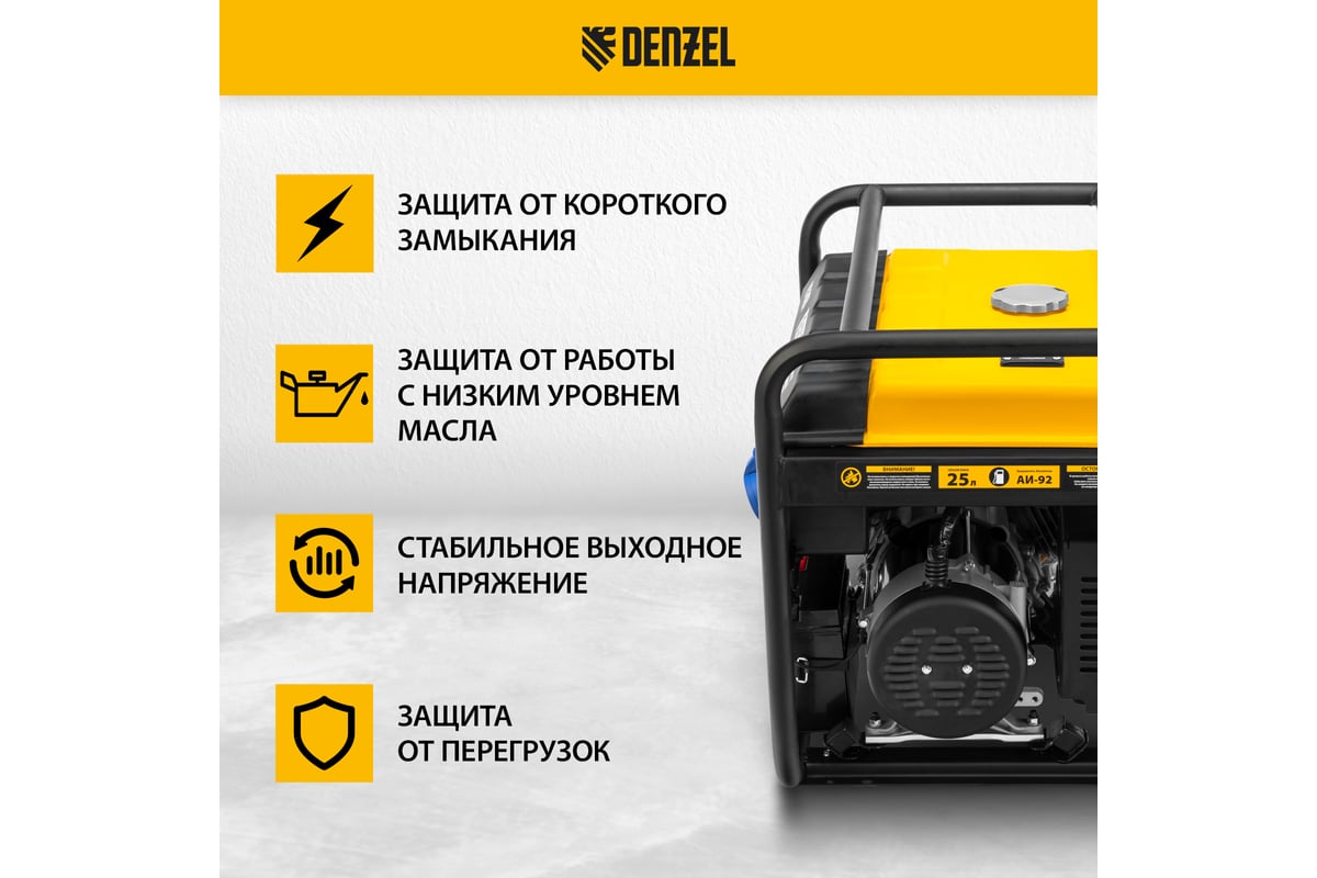 Предназначен для работы в загородном доме, на стройке, в гараже, для ремонтных бригад. Обеспечит приборы суммарной мощностью до 7 кВт. Большой бак позволяет работать без дозаправки до 10 часов. Удобное управление и система защиты от перегрузки, короткого замыкания и от запуска с низким уровнем масла сделают работу безопасной и комфортной. А детали из высококачественных материалов обеспечат надежность и долговечность. Преимущества Ручной, электрический и автоматический старт позволят легко включить генератор в любой ситуации. Двигатель защищен от работы при низком уровне масла - при падении ниже допустимой отметки генератор автоматически отключается. Усиленная конструкция рамы диаметром 32мм защитит от повреждений. С помощью цифрового дисплея легко отслеживать напряжение, частоту, моточасы и наличие масла. Лаконичная и интуитивно понятная панель управления. Каждая розетка имеет индивидуальный предохранитель. Силовая розетка 230В/32А позволяет снять полную мощность с генератора. Генератор поставляется в комплекте с аккумулятором для электрического старта. Имеет возможность подключения блока автоматического запуска арт.946714 для обеспечения полноценного автоматического резервного электроснабжения (в комплект не входит). Есть возможность установки транспортировочного комплекта (колеса, ручки) арт. 946725 , который значительно облегчает транспортировку генератора (приобретается отдельно). AVR сглаживает скачки напряжения при подключении и отключении оборудования. Уверенную работу генератора обеспечивает двигатель с высоким ресурсом DENZEL LONG LIFE. Его детали имеют высокую точность обработки. А улучшенная облегченная конструкция поршня, чугунная гильза, стальные распредвал и коленвал значительно продлевают срок службы. Медная обмотка альтернатора улучшает качество работы и повышает ресурс работы. Карбюратор от лидирующих производителей Китая. Свеча зажигания BOSCH. Гарантия 3 года!