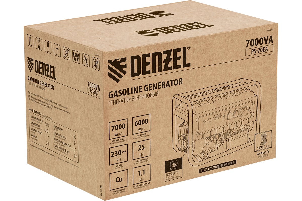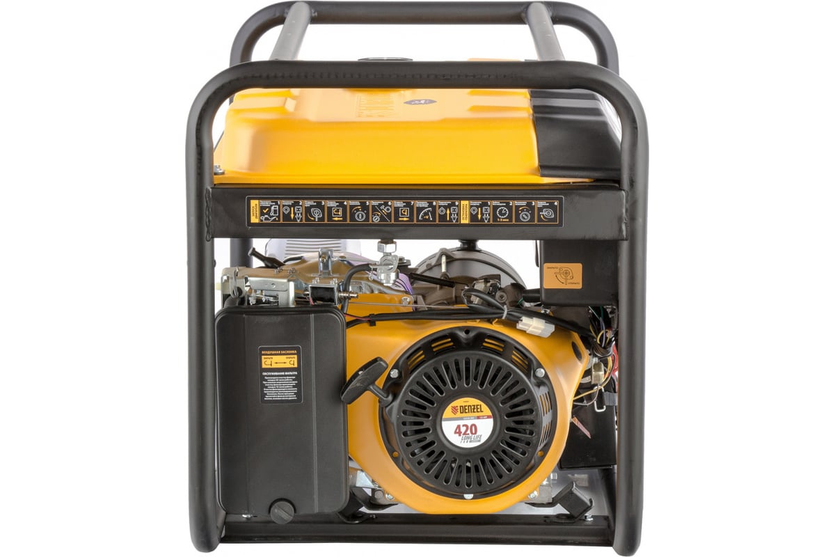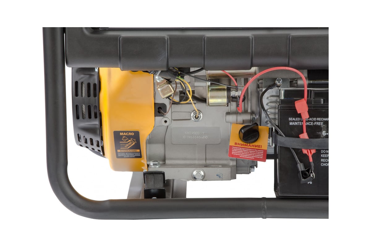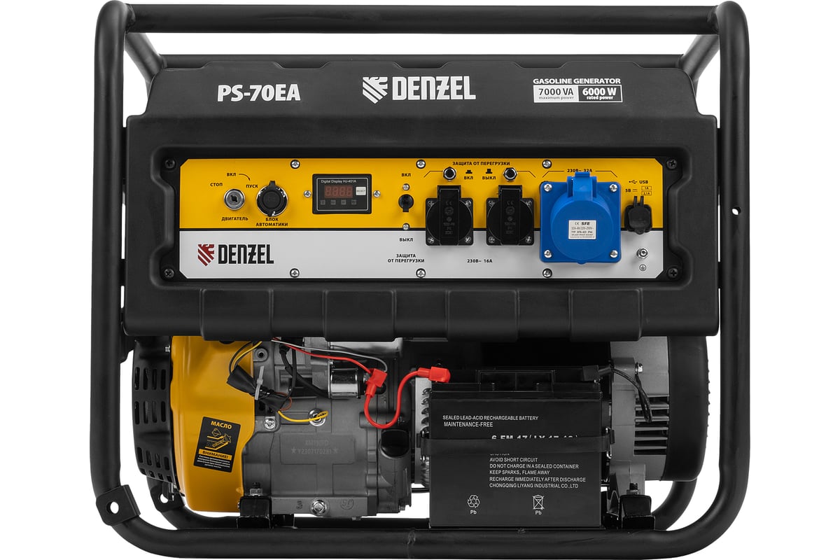 Предназначен для работы в загородном доме, на стройке, в гараже, для ремонтных бригад. Обеспечит приборы суммарной мощностью до 7 кВт. Большой бак позволяет работать без дозаправки до 10 часов. Удобное управление и система защиты от перегрузки, короткого замыкания и от запуска с низким уровнем масла сделают работу безопасной и комфортной. А детали из высококачественных материалов обеспечат надежность и долговечность. Преимущества Ручной, электрический и автоматический старт позволят легко включить генератор в любой ситуации. Двигатель защищен от работы при низком уровне масла - при падении ниже допустимой отметки генератор автоматически отключается. Усиленная конструкция рамы диаметром 32мм защитит от повреждений. С помощью цифрового дисплея легко отслеживать напряжение, частоту, моточасы и наличие масла. Лаконичная и интуитивно понятная панель управления. Каждая розетка имеет индивидуальный предохранитель. Силовая розетка 230В/32А позволяет снять полную мощность с генератора. Генератор поставляется в комплекте с аккумулятором для электрического старта. Имеет возможность подключения блока автоматического запуска арт.946714 для обеспечения полноценного автоматического резервного электроснабжения (в комплект не входит). Есть возможность установки транспортировочного комплекта (колеса, ручки) арт. 946725 , который значительно облегчает транспортировку генератора (приобретается отдельно). AVR сглаживает скачки напряжения при подключении и отключении оборудования. Уверенную работу генератора обеспечивает двигатель с высоким ресурсом DENZEL LONG LIFE. Его детали имеют высокую точность обработки. А улучшенная облегченная конструкция поршня, чугунная гильза, стальные распредвал и коленвал значительно продлевают срок службы. Медная обмотка альтернатора улучшает качество работы и повышает ресурс работы. Карбюратор от лидирующих производителей Китая. Свеча зажигания BOSCH. Гарантия 3 года!