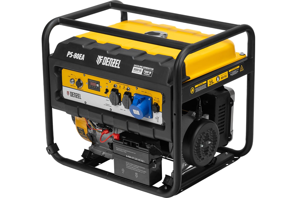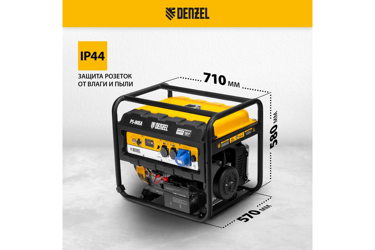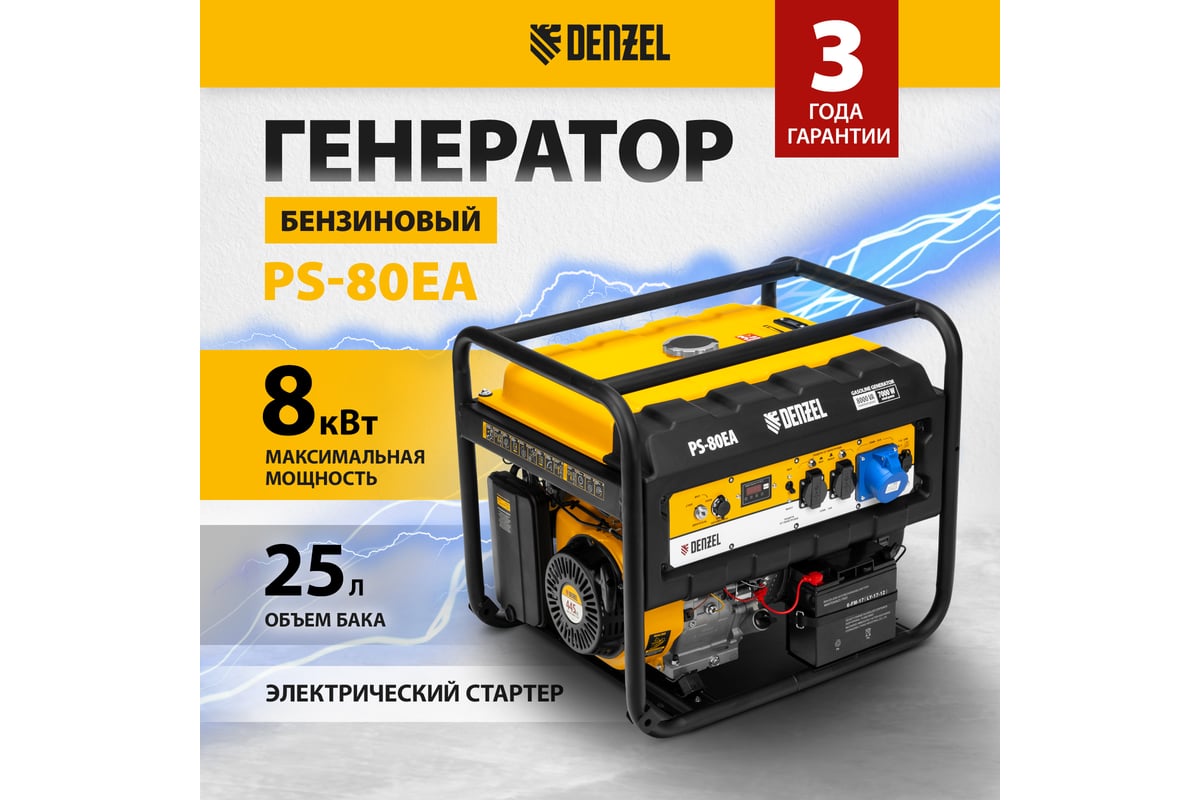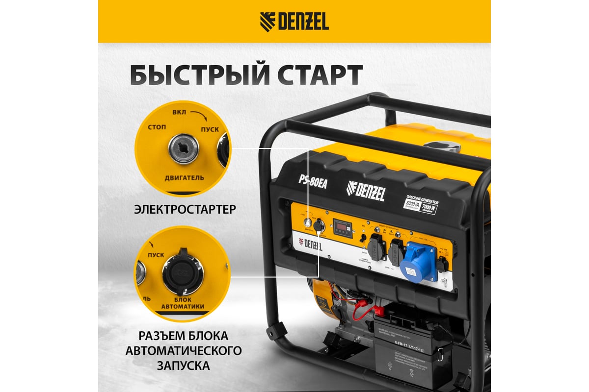 Бензиновый генератор Denzel PS 80 EA, 8,0 кВт, 230В, 25л 946924 обеспечит приборы суммарной мощностью 8 кВт. Подойдет для использования как в загородном доме, так и на строительной площадке. Благодаря большому баку проработает без дозаправки до 8 часов. Имеет возможность подключения блока автозапуска для полноценного резервного обеспечения электричеством дома. Имеет возможность подключения блока автоматического запуска арт. 946714 (в комплект не входит) для обеспечения полноценного автоматического резервного электроснабжения. Транспортировочный комплект (колеса, ручки) арт. 946725 приобретается отдельно.