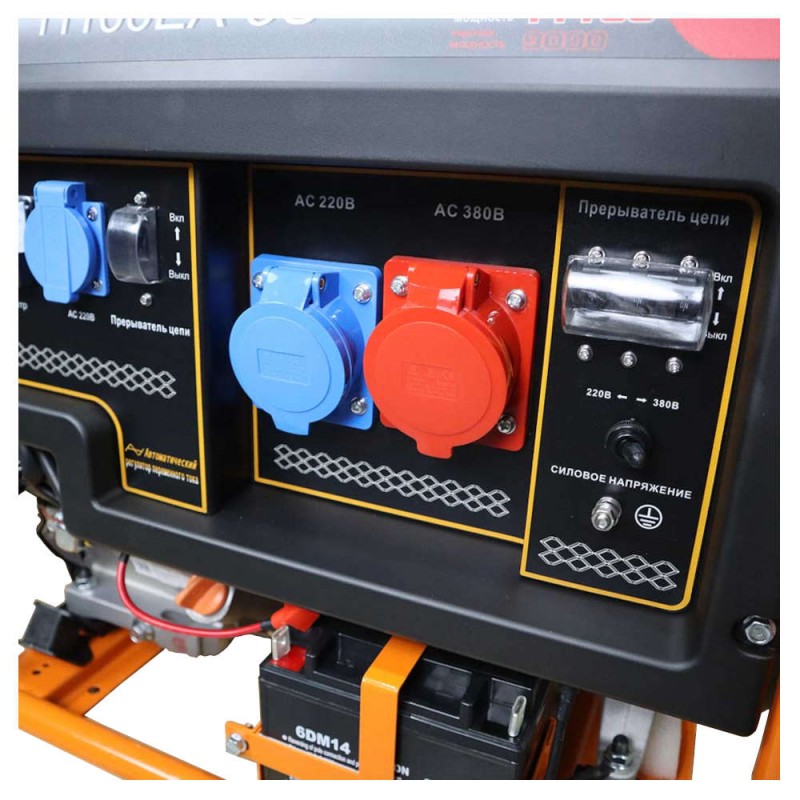Бензиновый генератор LIFAN 11100EA-3U используется в качестве резервного источника питания. Широко применяется в быту, в профессиональной сфере, на производственных площадках. Используется для подключения осветительных приборов, отопительного оборудования, электроинструментов, бытовой техники. Генератор имеет выходное напряжение 220В и 380В, что позволяет использовать его для бытовых и производственных задач. Усиленная металлическая рама делает конструкцию генератора жесткой и прочной, что актуально при работе на строительных объектах. Предусмотрена возможность подключения блока автоматики для организации электроснабжения в автоматическом режиме. Складные ручки и колеса позволяют без проблем перемещать генератор по рабочей площадке. Надёжный 4-х тактный бензиновый двигатель - развивает высокий крутящий момент и при этом имеет пониженный уровень шума и выхлопов Воздушное охлаждение - для продолжительной работы без перегрева Большая горловина топливного бака - способствует легкости заправки Индикатор уровня топлива - облегчает контроль за количеством топлива Пылезащитные розетки - надежно защищают гнезда розеток и обеспечивают их мгновенное закрытие после извлечения вилки Розетка 220В увеличенной мощности - для подключения наиболее мощных потребителей, расширяет возможности использования генератора Розетка 380В - для подключения трехфазных потребителей AVR-автоматический регулятор напряжения - обеспечивает стабильность характеристик для питания, в том числе наиболее требовательных потребителей Выход постоянного тока 12В - можно заряжать аккумуляторы автомобиля Возможность подключения блока автоматики - для организации электроснабжения в автоматическом режиме Усиленная металлическая рама - делает конструкцию генератора жесткой и прочной Автоматические предохранители в каждой цепи - защищают изделие и потребителей от перегрузок и коротких замыканий Вольтметр - позволяет визуально контролировать текущее напряжение под нагрузкой и без Электрический стартер - облегчает запуск генератора в любых условиях Колеса и ручки - для удобства транспортировки