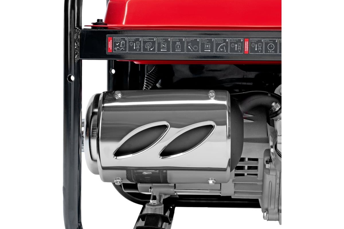 - Защита двигателя — генератор не запускается при низком уровне масла, воздушный и топливный фильтры предотвращают попадание твердых частиц в цилиндр и посторонних примесей в топливо