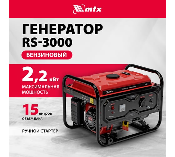 Бензиновый генератор MTX RS-3000 946105 максимальной мощностью 2,2 кВт, с ручным стартером, — резервный источник питания, поддерживающий напряжение 230 В и обеспечивающий работу бытовой техники, электроинструмента, осветительных приборов и других потребителей в случае отсутствия электросети. Для подключения потребителя предусмотрена розетка 230 В/16 А. Блок AVR стабилизирует напряжение, что позволяет подключать даже чувствительную технику. Генератор пригодится в загородном доме.