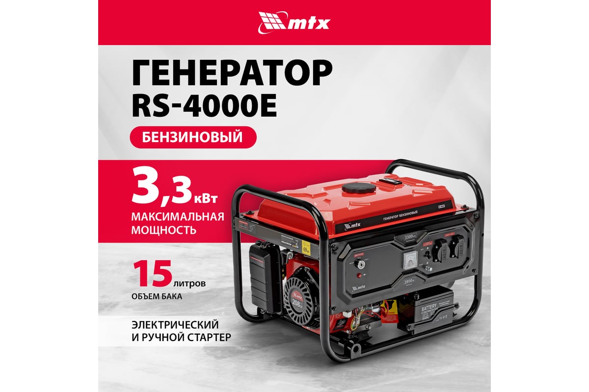 Бензиновый генератор MTX RS-4000E 946125 максимальной мощностью 3,3 кВт, с электростартером, — резервный источник питания, поддерживающий напряжение 230 В и обеспечивающий работу бытовой техники, электроинструмента, осветительных приборов и других потребителей в случае отсутствия электросети. Для подключения потребителей предусмотрены 2 розетки 230 В/16 А. Блок AVR стабилизирует напряжение, что позволяет подключать даже чувствительную технику. Генератор пригодится в загородном доме