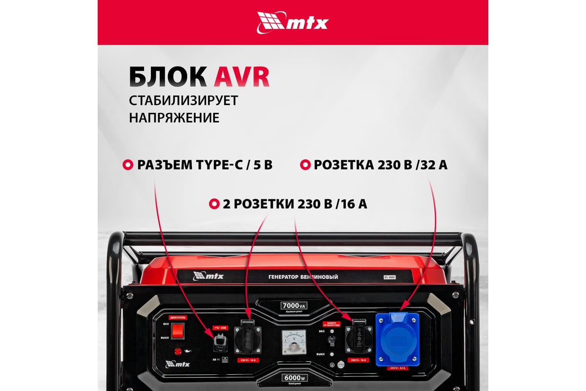 Бензиновый генератор MTX RS-9000 946155 максимальной мощностью 7 кВт, с ручным стартером, поддерживает напряжение 230 В и обеспечивает функционирование бытовой техники, электроинструмента, осветительных приборов и других потребителей в случае отсутствия электросети или перебоев в ее работе. Стабилизатор напряжения AVR защищает чувствительные приборы от поломки. Для подключения потребителей служат 2 розетки 230 В/16 А, для питания мощной техники предназначена силовая розетка 230 В/32 А. На панели управления также предусмотрен выход постоянного тока USB/TYPE-C 5 В, позволяющий заряжать смартфоны, планшеты и другие гаджеты. Генератор пригодится владельцам загородных участков.