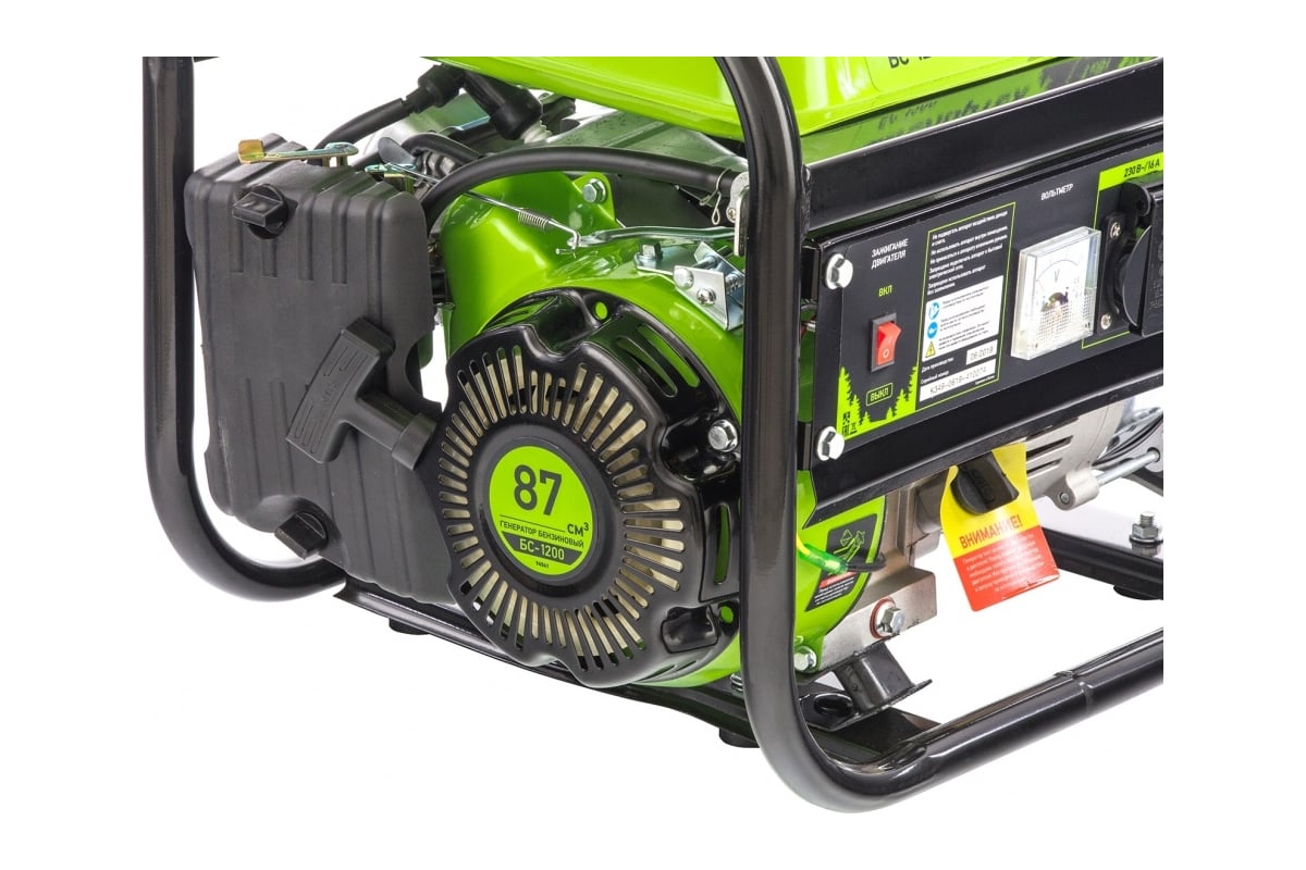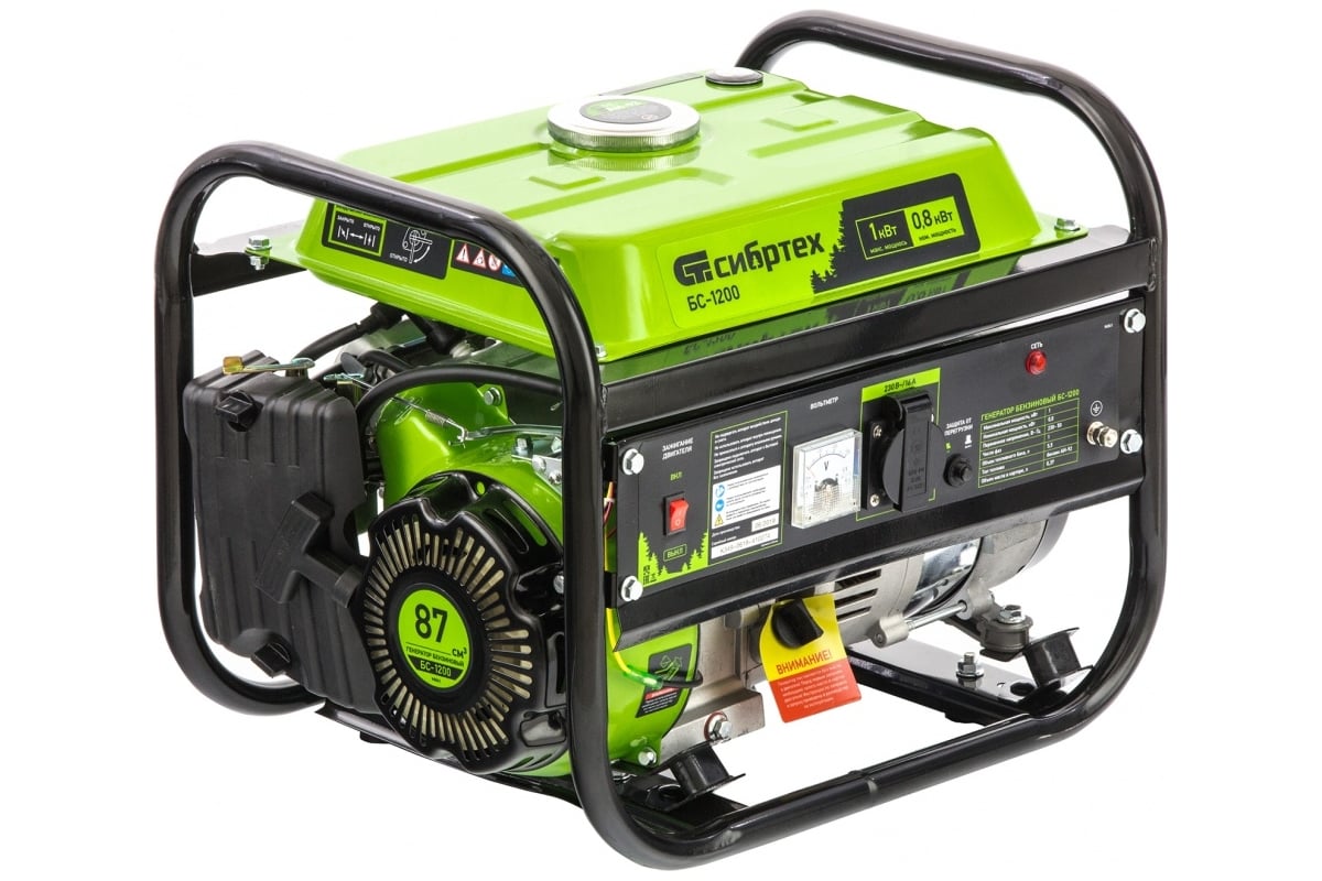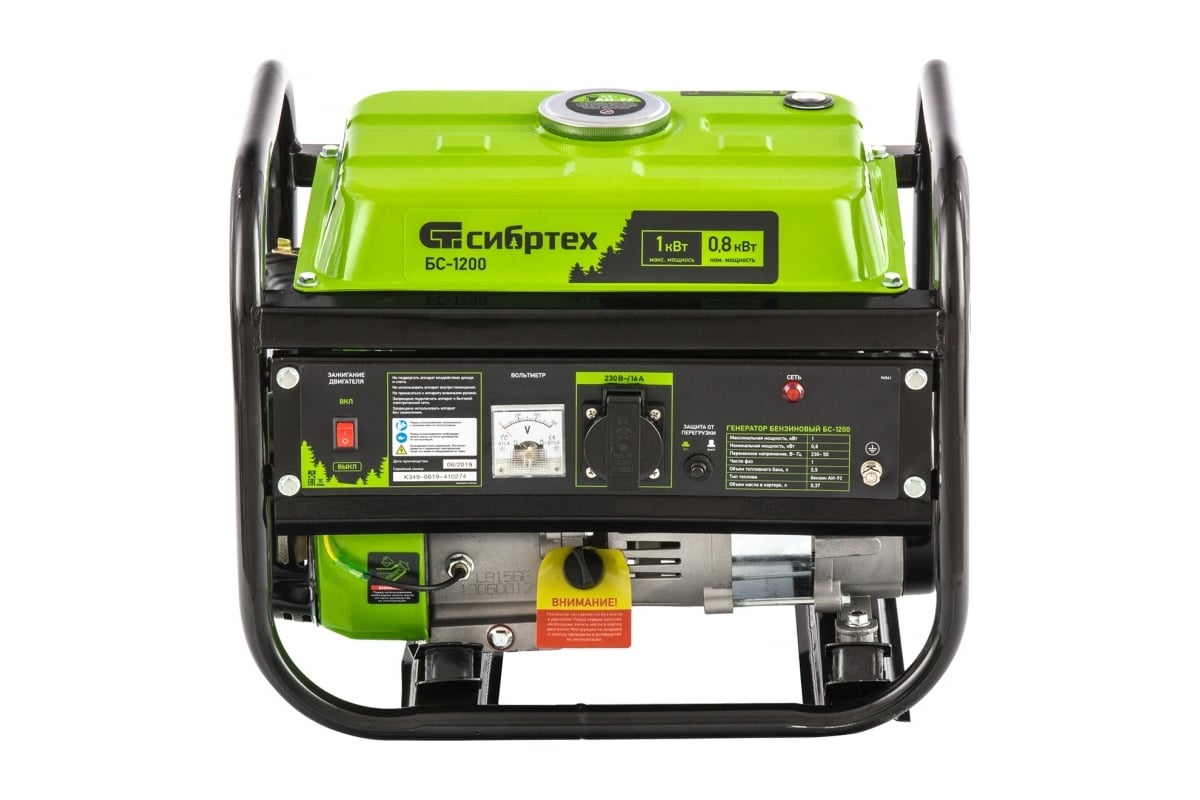 Компактный, легкий 22,9 кг и недорогой генератор Сибртех БС-1200 мощностью 1 кВт рассчитан на подключение одного инструмента с высоким пусковым током, такого как дрель, перфоратор, углошлифовальная машина. Также его можно использовать в качестве простой резервной системы электроснабжения на природе, в мастерской или на даче. Вырабатываемой мощности в 800 Вт хватит для одновременного обеспечения электричеством 4 ламп накаливания, компьютера и роутера. Топливный бак 5,5 л обеспечит работу до 6 часов без дозаправки. Преимущества Блок AVR обеспечивает работу без скачков напряжения, а значит к генератору можно подключать даже чувствительную технику. Индикатор подключения к сети обеспечивает безопасность, исключая случайный запуск. Удобно контролировать напряжение в сети благодаря вольтметру. Легко отслеживать уровень бензина благодаря индикатору топлива. Комплексная система защиты от работы при низком уровне масла, от перегрузки и короткого замыкания продлевает срок службы генератора. Удобное и простое управление - все элементы контроля расположены на передней панели. Система воздушного охлаждения обеспечивает эффективный отвод тепла для стабильной работы двигателя. Генератор заключен в стальную защитную раму, которая также является и ручками для переноски.