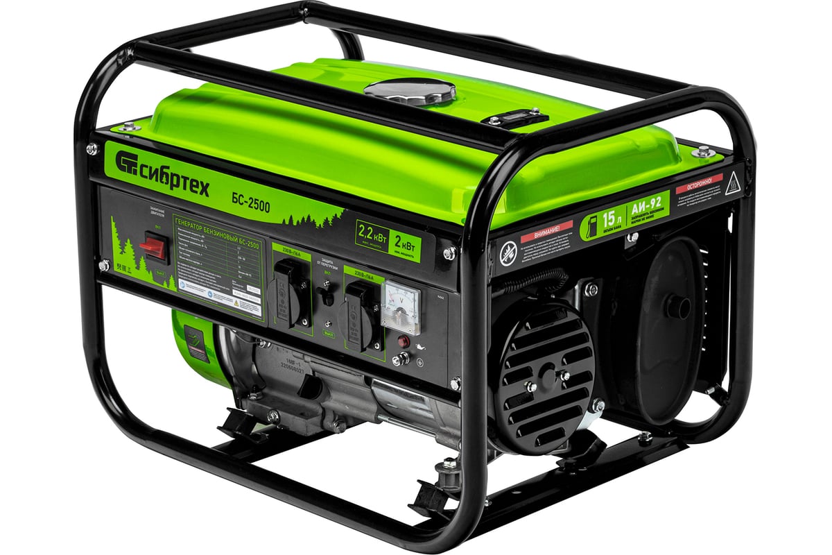Бензиновый генератор Сибртех БС-2500 94542 на 230 В, максимальной мощностью 2,2 кВт, с 4-тактным двигателем и баком объемом 15 л, идеально подходит для использования на даче, на природе или в мастерской. Небольшой вес 34,5 кг и компактность позволяют легко перевозить и брать его с собой. Мощности 2 кВт достаточно для одновременного подключения холодильника и микроволновой печи.