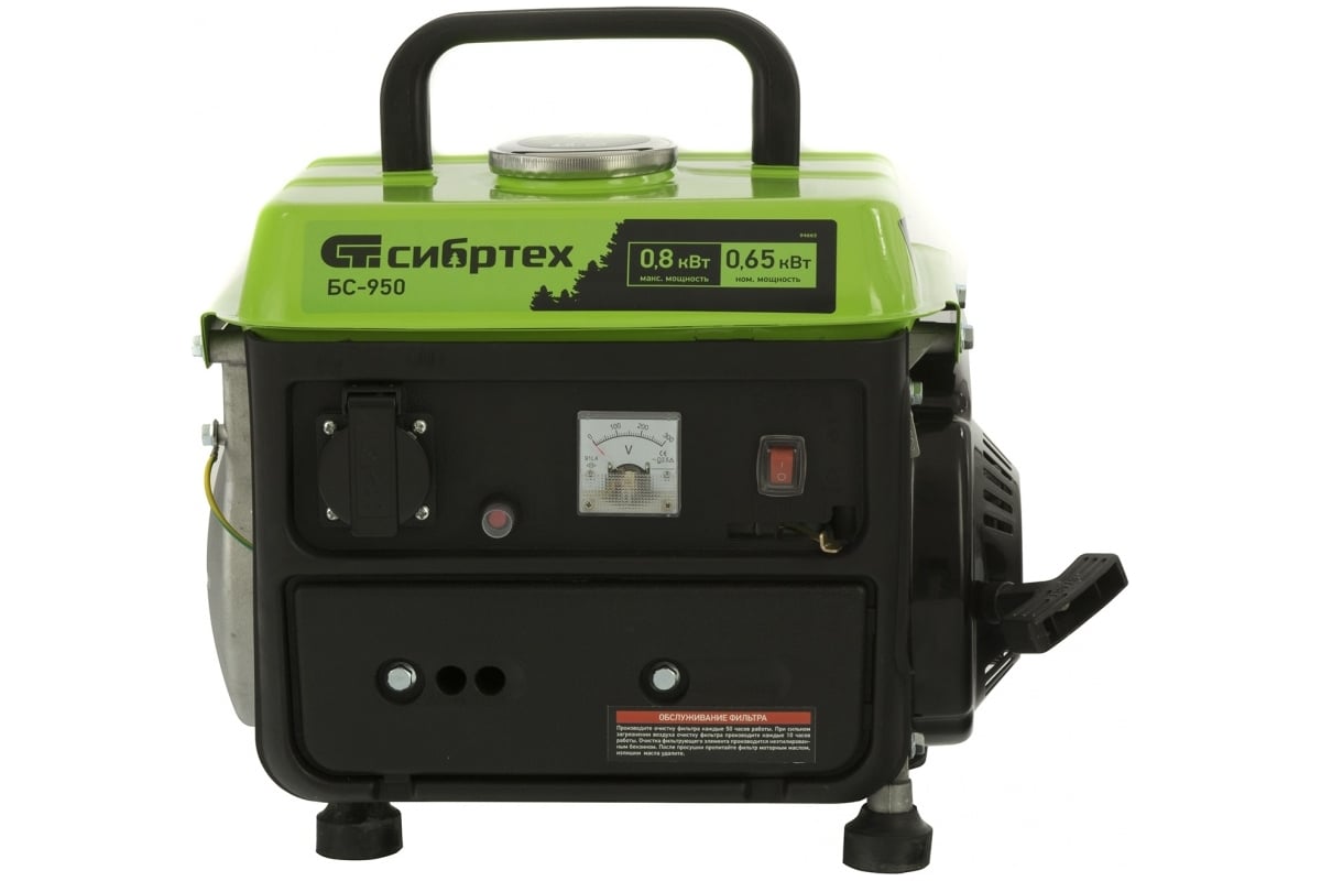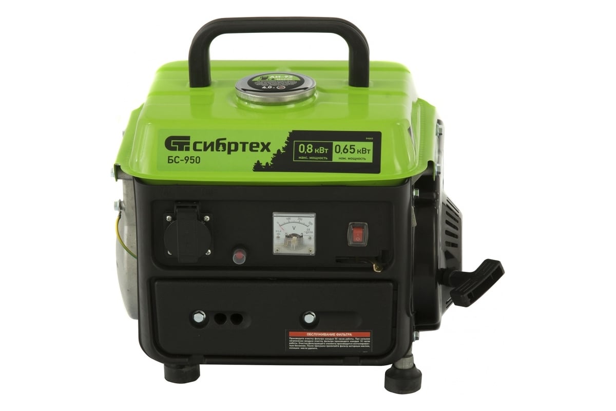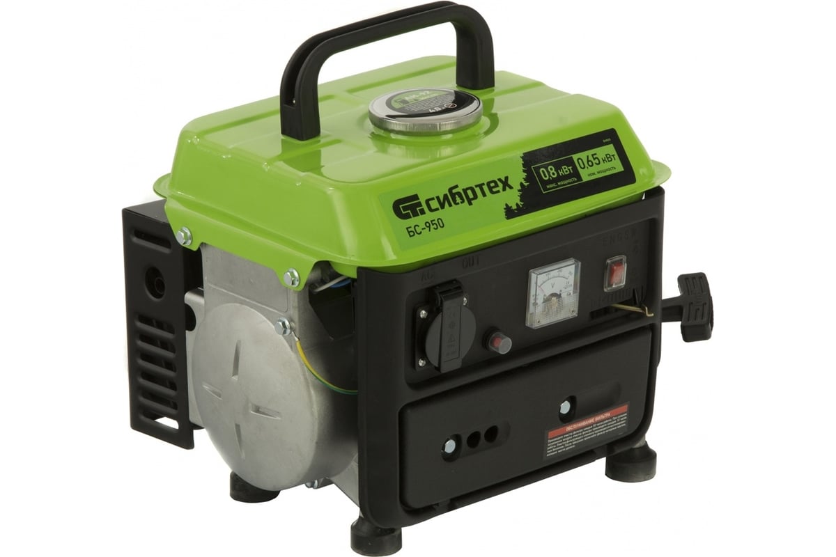 СИБРТЕХ Генератор бензиновый БС-950, 0.8 кВт, 230 В, 2-х тактный, 4 л, ручной стартер 94665 Назначение: бензиновый генератор СИБРТЕХ БС-950 служит для электроснабжения в мастерские, магазины, жилые объекты, на стройплощадках и в полевых условиях. Номинальная мощность - 0,65 кВт. Позволяет подключить и использовать приборы и оборудование при отсутствии или перебоях основной электросети. Двигатель: установка реализована на базе бензинового двигателя СИБРТЕХ мощностью 2 л.с. В роли топлива рекомендуется использовать бензин АИ-92. Конструкция: модель расположена в кожухе, защищающем рабочие элементы от повреждений. Оборудованы вспомогательные индикаторы, которые информируют о перегрузках. Преимущества: прибор оснащен синхронным альтернатором с автоматическим контролем напряжения. Генератор отличается сниженным уровнем шума, а также долгим сроком эксплуатации. Особенности Индикатор уровня масла Низкий уровень шума Малый расход топлива