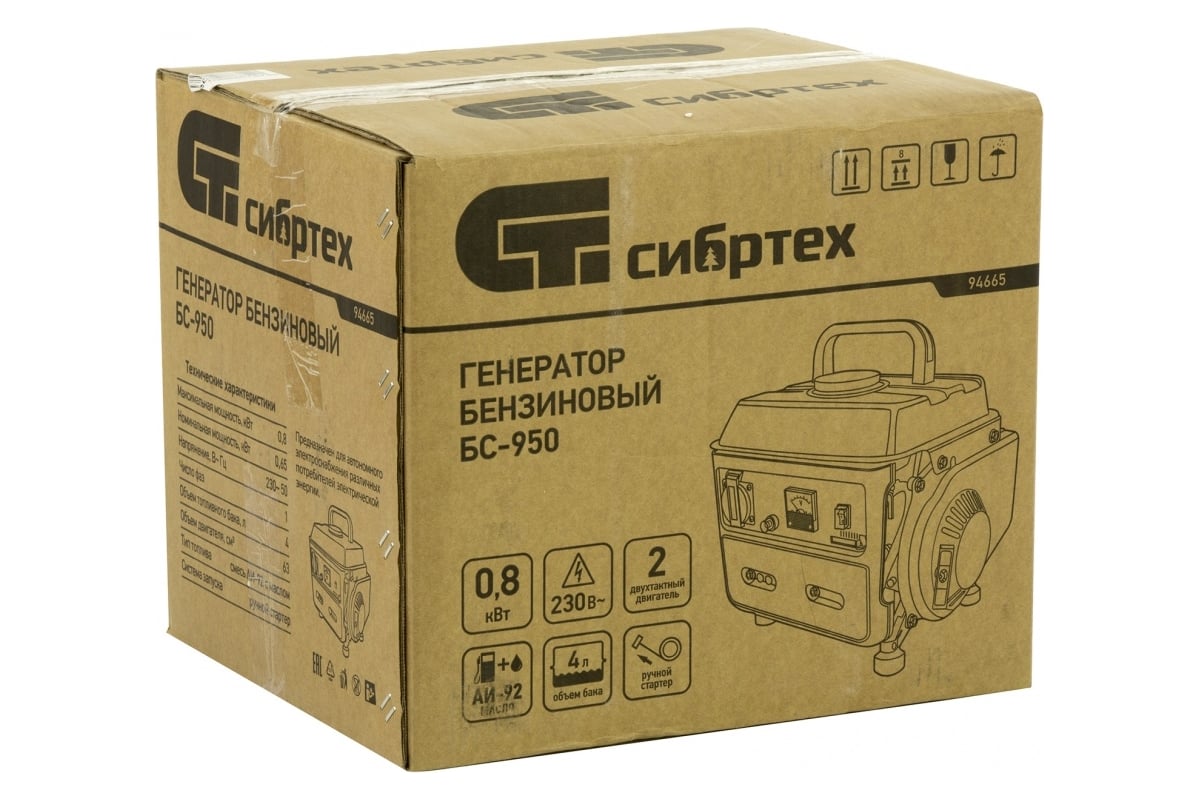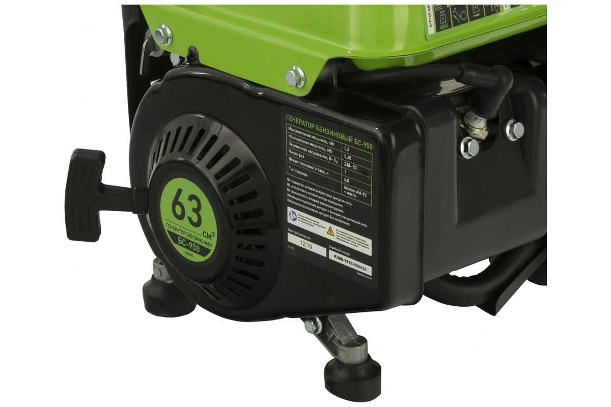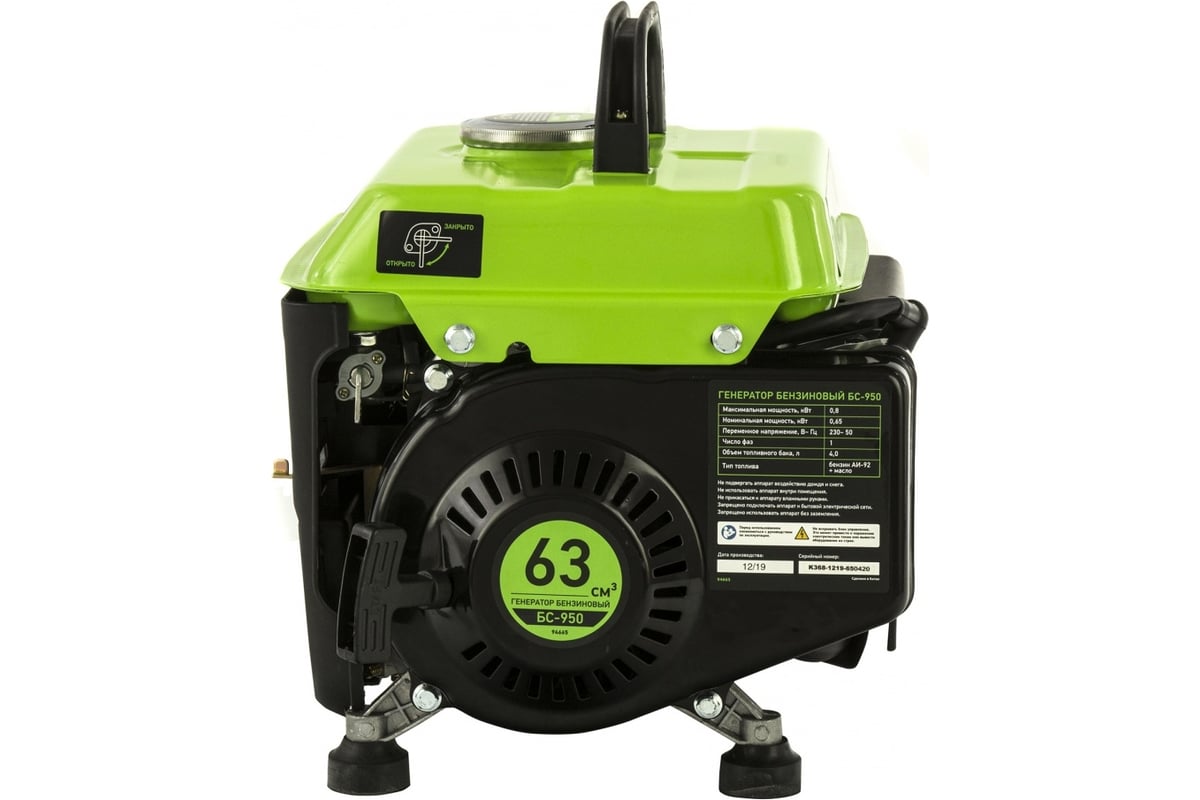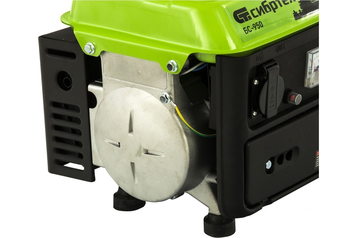 СИБРТЕХ Генератор бензиновый БС-950, 0.8 кВт, 230 В, 2-х тактный, 4 л, ручной стартер 94665 Назначение: бензиновый генератор СИБРТЕХ БС-950 служит для электроснабжения в мастерские, магазины, жилые объекты, на стройплощадках и в полевых условиях. Номинальная мощность - 0,65 кВт. Позволяет подключить и использовать приборы и оборудование при отсутствии или перебоях основной электросети. Двигатель: установка реализована на базе бензинового двигателя СИБРТЕХ мощностью 2 л.с. В роли топлива рекомендуется использовать бензин АИ-92. Конструкция: модель расположена в кожухе, защищающем рабочие элементы от повреждений. Оборудованы вспомогательные индикаторы, которые информируют о перегрузках. Преимущества: прибор оснащен синхронным альтернатором с автоматическим контролем напряжения. Генератор отличается сниженным уровнем шума, а также долгим сроком эксплуатации. Особенности Индикатор уровня масла Низкий уровень шума Малый расход топлива