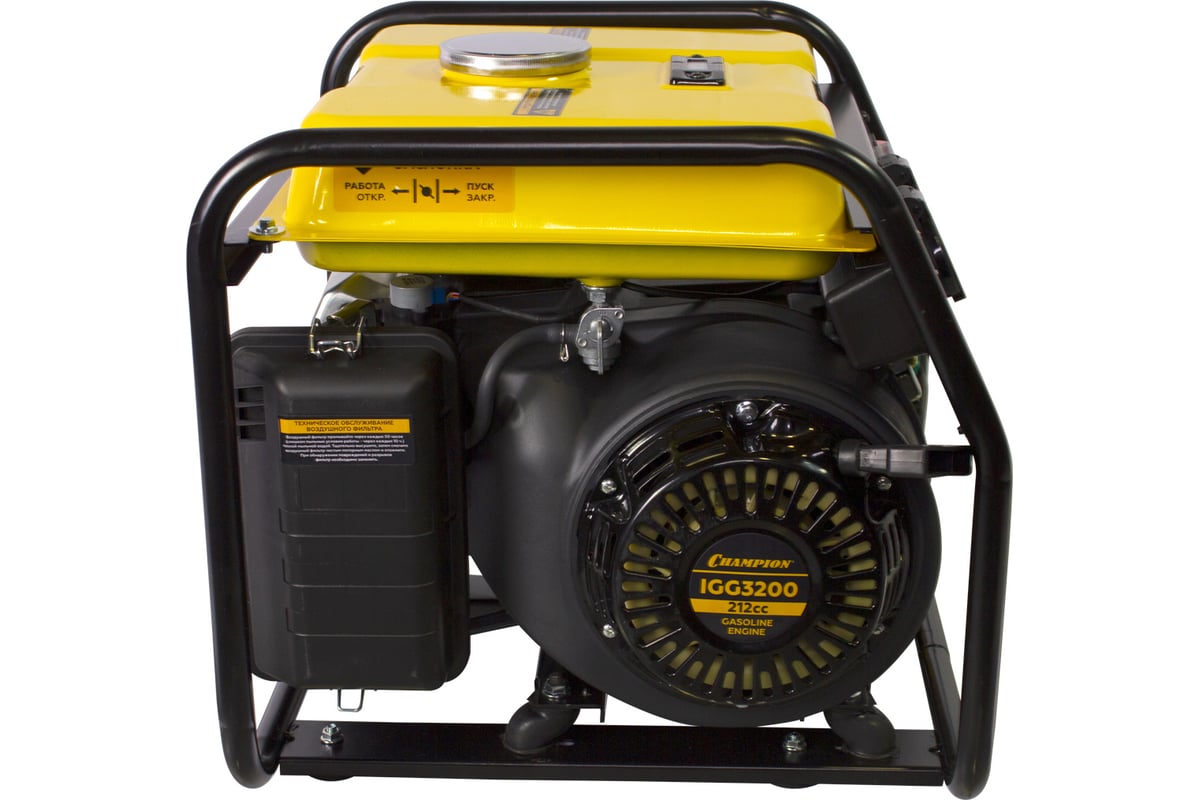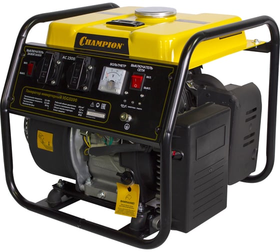 Генератор Champion 3,2/3,5кВт, 7лс, 5,7л, 26кг IGG3200 представляет собой модель инверторного типа. Имеет две розетки переменного тока на 16 А. Напряжение 220 В.