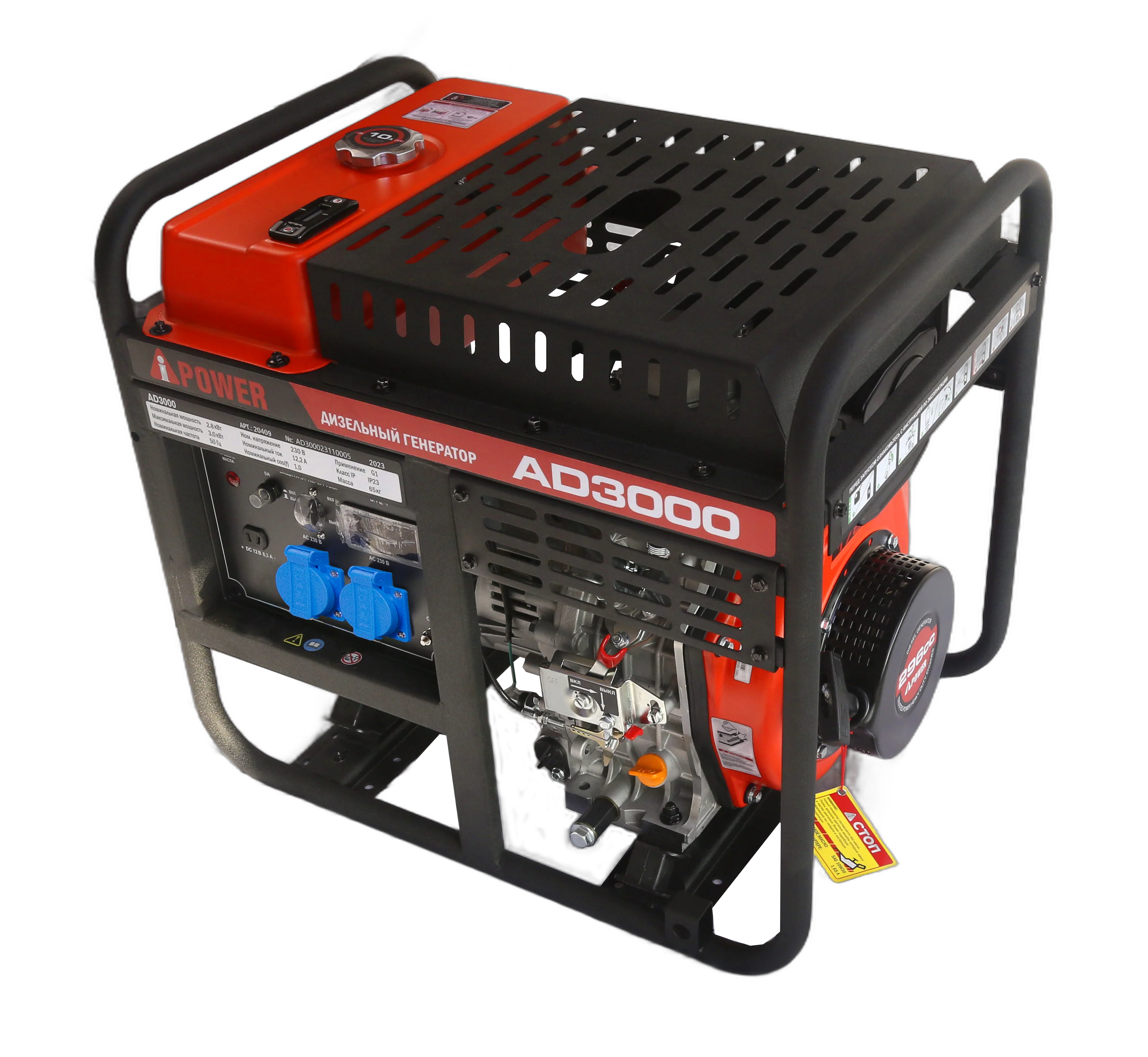 Дизельный генератор A-iPower AD3000 пригодится в качестве автономного источника однофазного тока в частном доме, гараже, мастерской или на строительной площадке при отключении или отсутствии электроэнергии. К портативной электростанции можно подключать электрооборудование, потребляющее до 2,8 кВт. Четырехтактный двигатель с воздушным охлаждением мощностью 5,5 л.с. запускается с помощью ручного стартера. При необходимости можно приобрести транспортировочный комплект, состоящий из ручки и колес. Ключевые особенности: Индикатор уровня топлива. Открытый кожух в виде прочной стальной рамы. Топливный бак емкостью 10 л с индикатором уровня. Система авторегулировки выходного напряжения. Амортизаторы для снижения шума и вибрации. Максимальная мощность 3 кВт. A-iPower AD3000 в работе При вытягивании шнура стартера не требуется прилагать излишние усилия благодаря системе облегченного запуска. Вы можете подключать потребителей к двум розеткам 230 В/16 А и выходному 12-вольтовому разъему постоянного тока. На цифровом табло отображаются значения напряжения, тока, частоты и моточасов. Преимущества модели Топливный бак снабжен индикатором для удобства отслеживания оставшегося уровня топлива. Генератор A-iPower AD3000 имеет открытый кожух, выполненный в виде крепкой стальной рамы, покрытой порошковой краской. Амортизаторы, установленные в местах крепления двигателя, эффективно снижают вибрации и шум. Безопасность и надежность Для обеспечения стабильного электроснабжения генератор оборудован системой автоматической регулировки напряжения. Во избежание поломки двигатель не заводится при недостаточном уровне масла в картере. В случае превышения нагрузки или короткого замыкания дизельный генератор прекращает выработку электроэнергии и отключает потребителей.