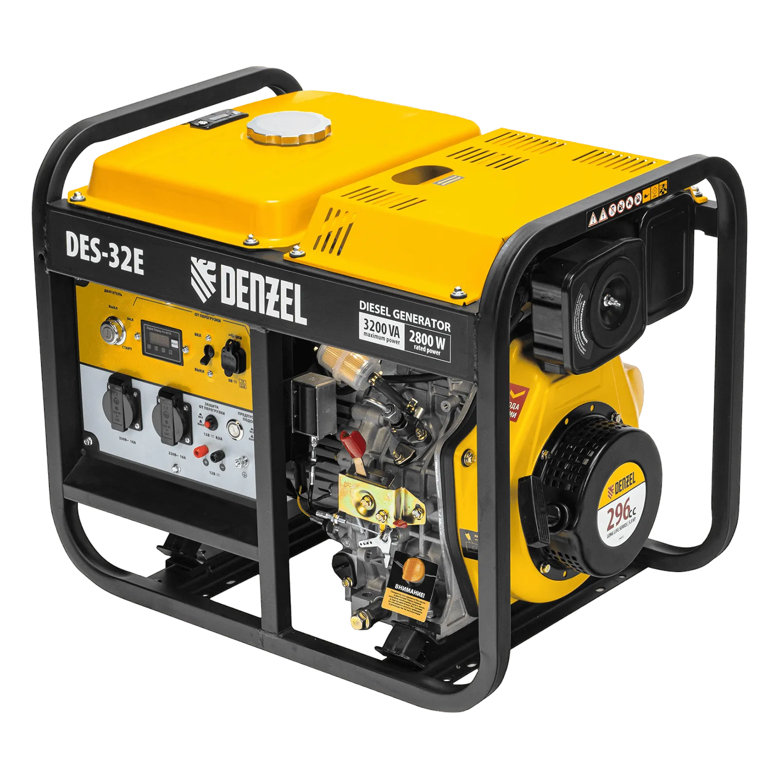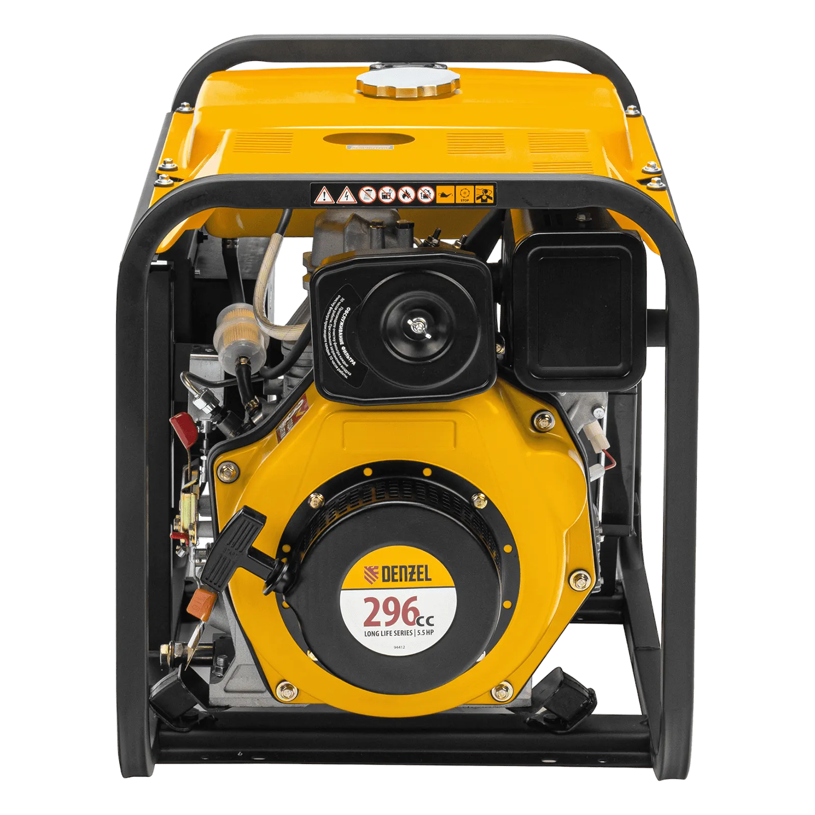 - Мобильность — к генератору можно приобрести транспортировочный комплект Denzel 94905 для перемещения по рабочей площадке