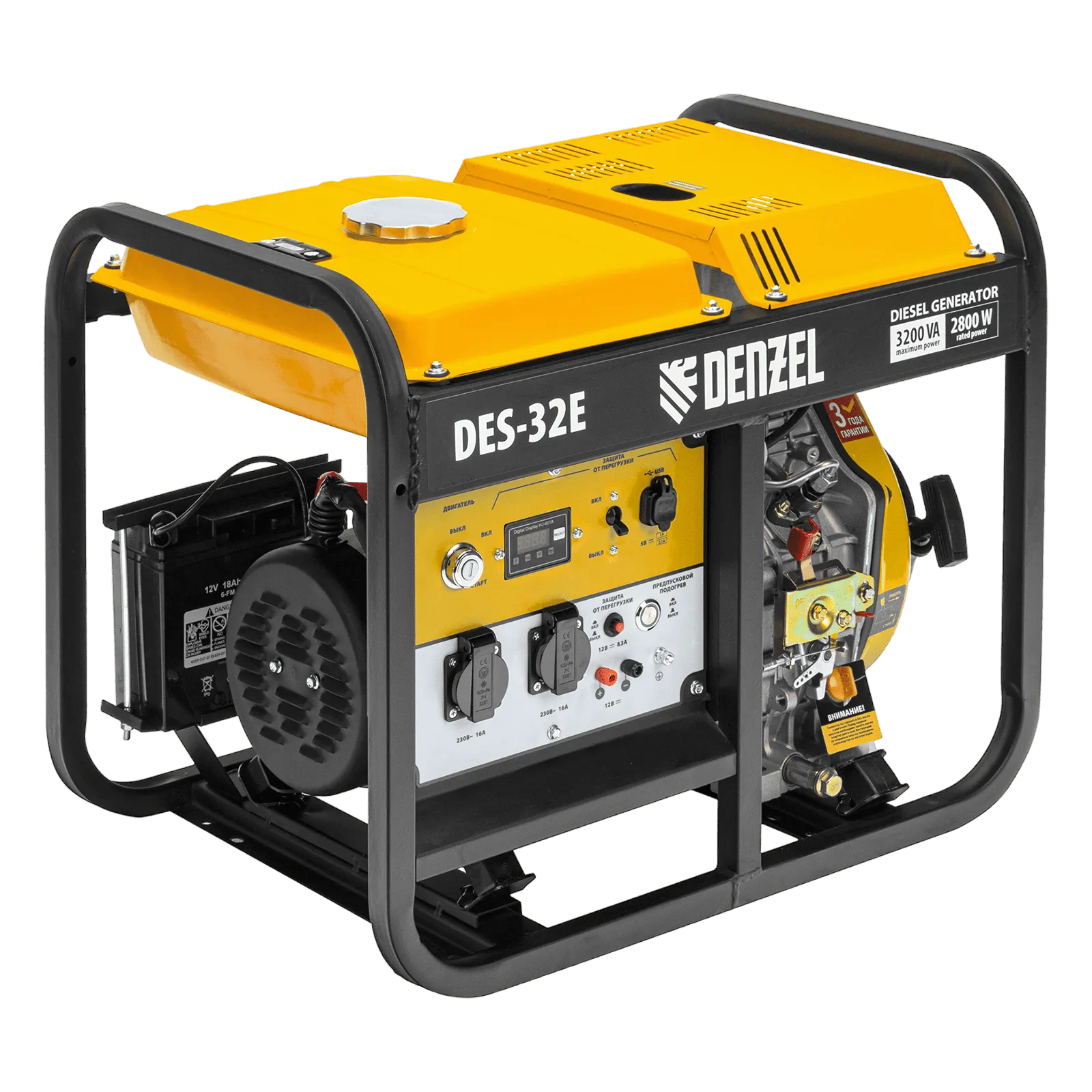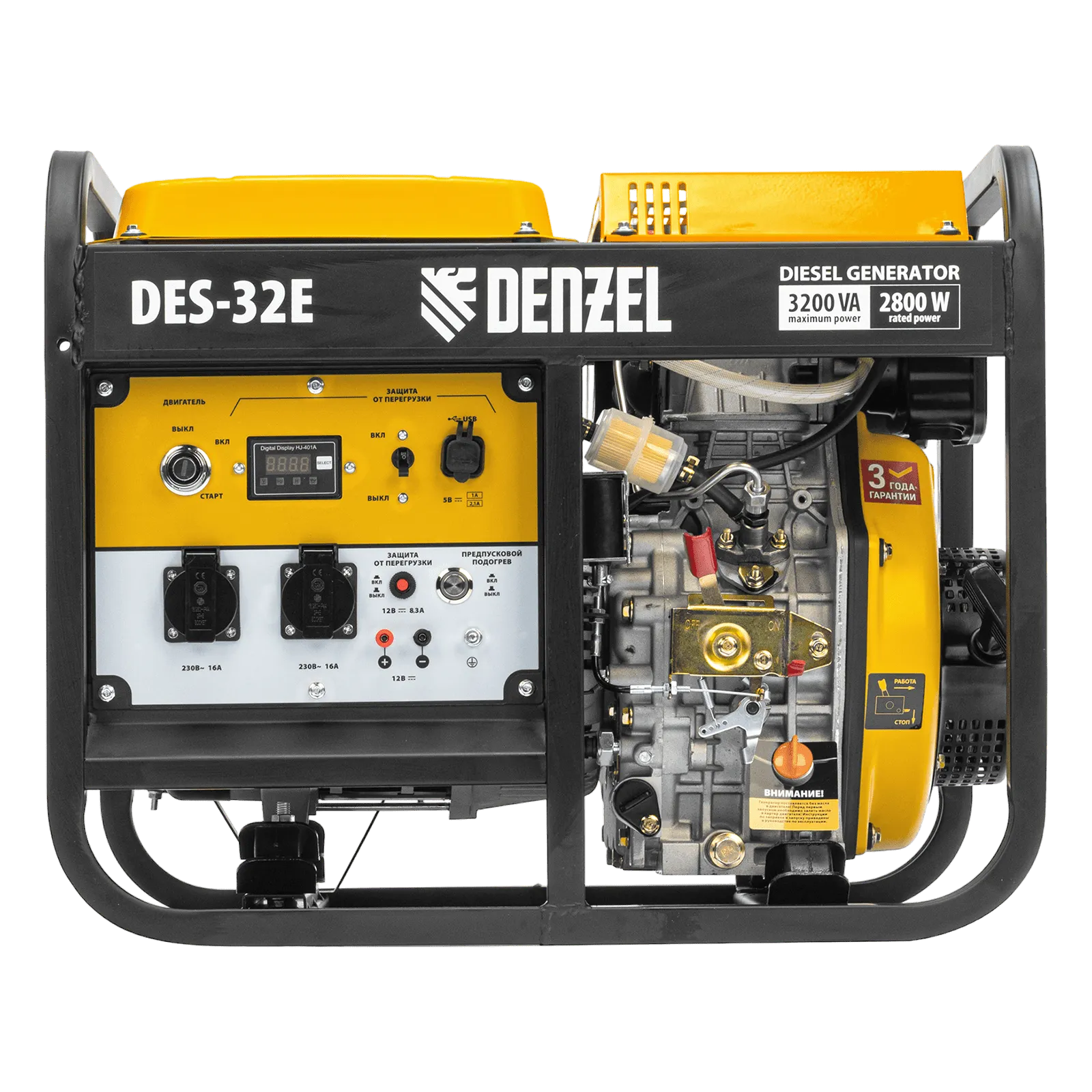 Дизельный генератор имеет максимальную выходную мощность 3,2 кВт и поддерживает напряжение в сети 230 В. Используется для снабжения энергией потребителей однофазного тока (осветительных приборов, бытовой техники, электроинструмента) при отсутствии доступа к стационарному источнику питания. Для подключения электроприборов служат 2 розетки 230 В/16 А. Клеммы постоянного тока 12 В позволяют заряжать автомобильные аккумуляторы, а двойной выход USB 5 В предназначен для подключения мобильных устройств (планшетов, смартфонов и т. д.). Генератор пригодится в загородном доме. Особенности - Функция предпускового подогрева Преимущества