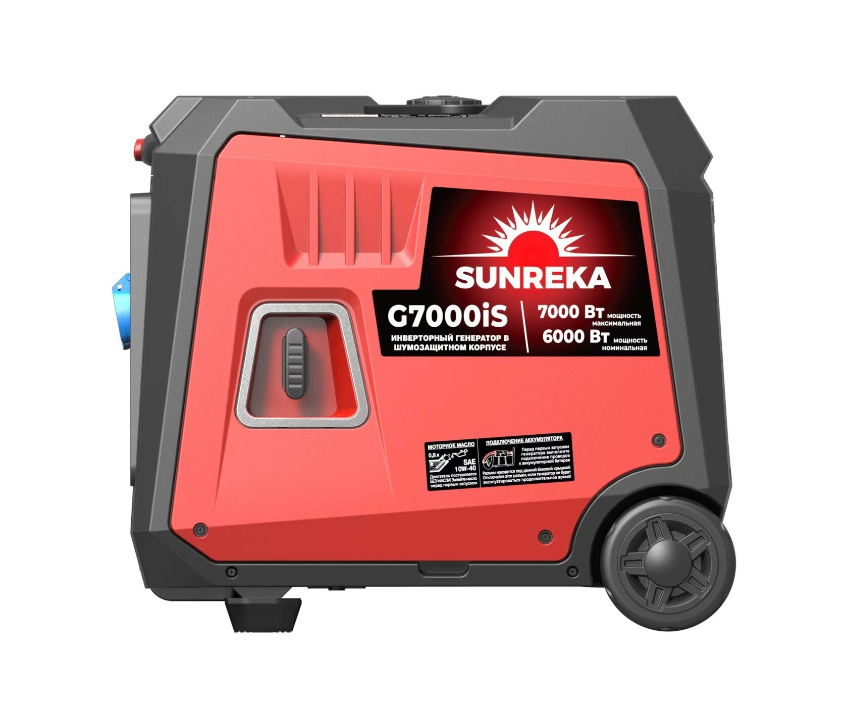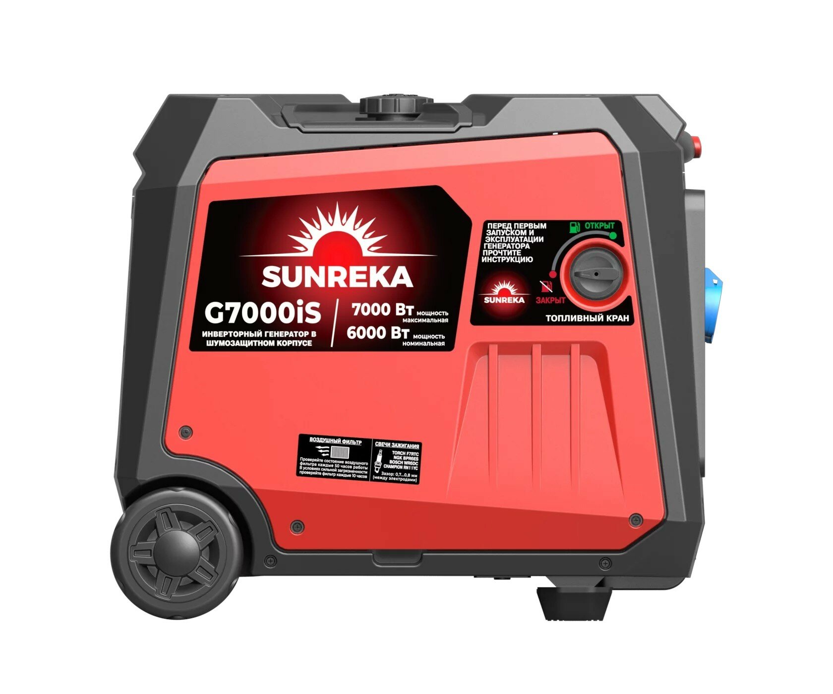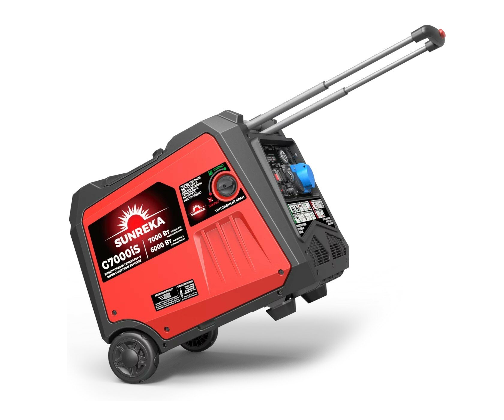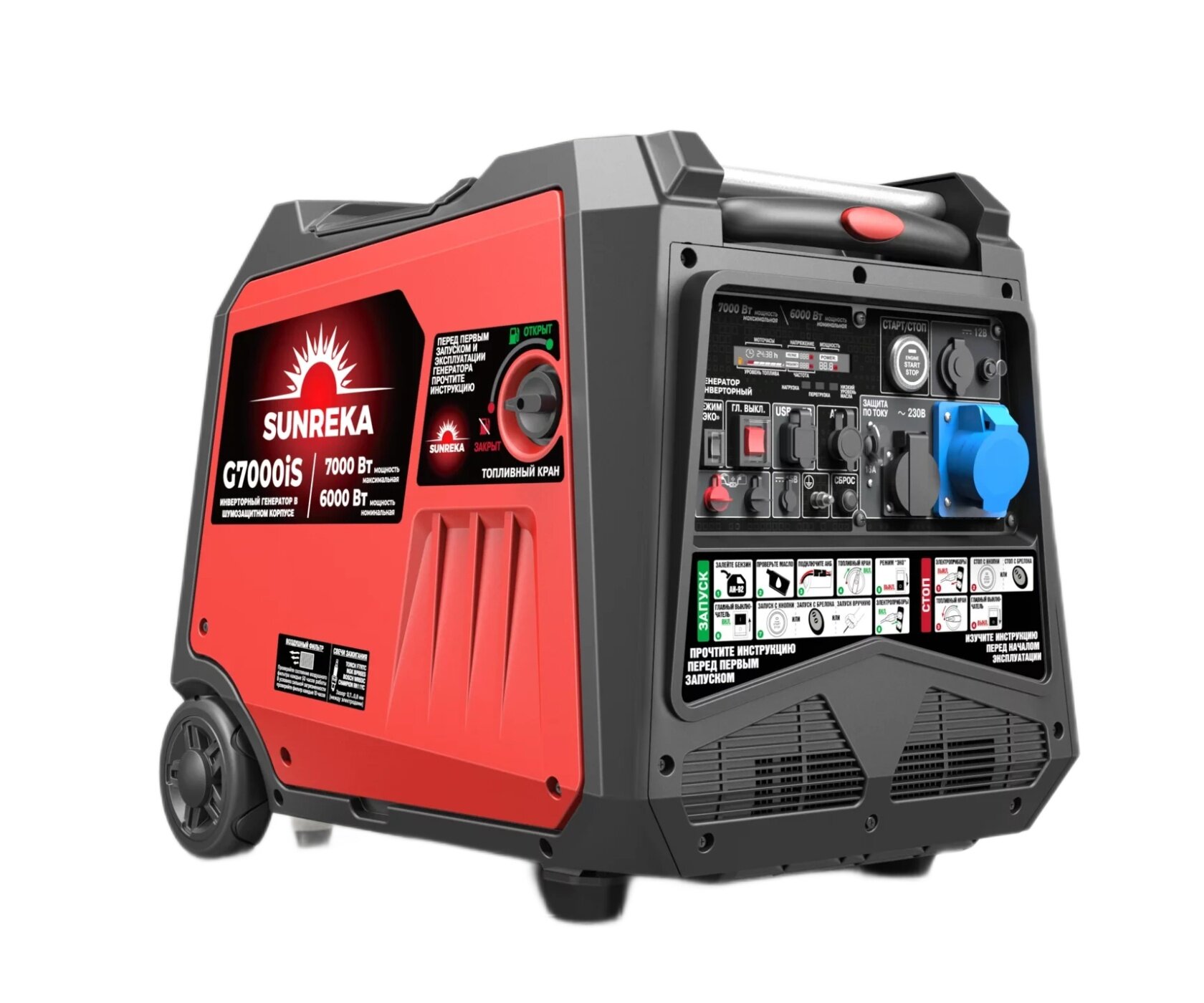 Пластиковый корпус с шумоизоляцией генератора G7000iS обеспечивает сохранность основных узлов и низкий уровень шума во время работы: не более 63 дБ(А) на расстоянии 7 метров. Двигатель генератора G7000iS рабочим объемом 312 см3 запускается ручным стартером быстро и легко, а переключатель управления воздушной заслонкой на передней панели позволяет контролировать запуск и прогрев двигателя при низких температурах. Генератор G7000iS оснащен всеми необходимыми функциями безопасности, такие как защита от короткого замыкания, перегрузки, перепадов напряжения и никого уровня масла, что обеспечивает безопасную эксплуатацию. Топливный бак 12,5 литра обеспечивает 9 часов непрерывной работы от одной заправки при нагрузке 50% (1,75 кВт) и 2,5 часа при 100% нагрузке (6 кВт). С помощью параллельного подключения второго инверторного генератора SUNREKA можно увеличить выходную мощность электрической сети. РЕКОМЕНДАЦИИ ПО ПРИМЕНЕНИЮ SUNREKA G7000iS Генератор G7000iS по праву можно назвать самым новым, технологичным, компактным и удобным среди инверторных тихих генераторов номинальной мощностью 6 кВт: - при габаритах 72х55х60 см и массе всего лишь 52 кг, генератор G7000iS выдает «честную» номинальную продолжительную мощность 6 кВт! - при своей компактности и низкой массе, генератор G7000iS является одним из самых тихих генераторов в классе: уровень шума (звуковое давление) на расстоянии 7 метров составляет всего лишь 63 дБ(А). - габариты и масса указаны с учетом уже установленных задних колес и с телескопической полностью задвижной ручкой, которые позволяют перемещать генератор легко и быстро! Такие выдающиеся характеристики стали достижимы благодаря новому технологичному HIGH-SPEED двигателю рабочим объемом 312 куб.см, модернизированному альтернатору и оптимальной компоновки внутри корпуса. Генератор G7000iS это идеальный вариант для кемпинга большой компанией, походов и поездок на природу, для коммунальных служб, проведения отделочных/строительных работ. Мощности 6 кВт также хватит для электроснабжения небольшого летнего дома и дачи, а возможность создания автоматического ввода резерва, при этом Пользователь получает чистую электроэнергию, можно подключать к сети любые, даже требовательные к качеству тока электроприборы. Экономичный, тихий, легкий, компактный, с напряжением и током высочайшего качества, генератор G7000iS обеспечит электропитание не только освещения и электроинструмента для отделочных работ, но и любого другого электронного оборудования, такого как музыкальная аппаратура, радиоэлектронная аппаратура, ТВ, приставки, компьютеры, ноутбуки и др.