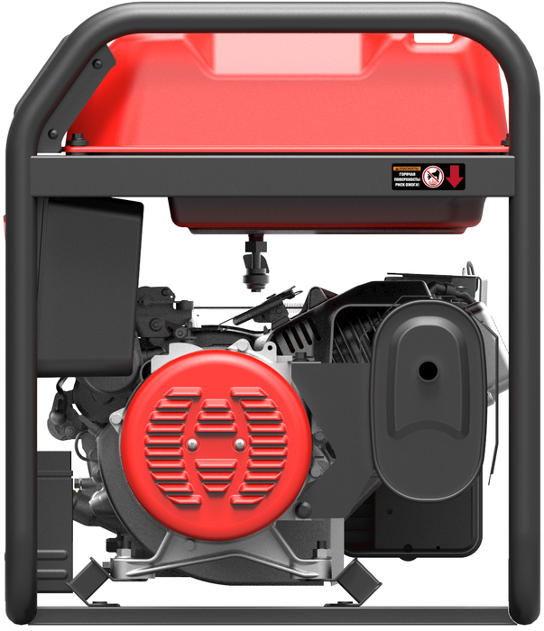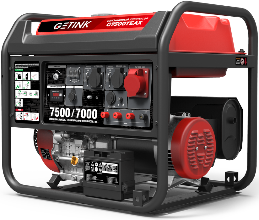Генератор имеет сварную раму и стальную переднюю панель, которые защищают основные узлы оборудования и придают общую жесткость и прочность конструкции. Двигатель генератора рабочим объемом 458 см3 оснащается электростартером и сменной аккумуляторной батареей для запуска с ключа. Генератор запускается быстро и легко даже при низких температурах, работа воздушной заслонки автоматизирована, поэтому управиться с данной моделью под силу даже женщинам и пожилым людям. Генератор оснащен всеми необходимыми функциями безопасности, такие как защита от короткого замыкания, перегрузки, перепадов напряжения и никого уровня масла, что обеспечивает безопасную эксплуатацию. При подключении блока автозапуска с генератором можно организовать автоматический ввод резерва: систему обеспечения непрерывного электроснабжения в автоматического режиме при обрывах сети. Топливный бак 40 литров обеспечивает 13 часов непрерывной работы от одной заправки при нагрузке 75% (5,3 кВт) и 10 часов при 100% нагрузке (7,0 кВт). Есть возможность установить колеса и передние рукоятки для удобной транспортировки генератора.