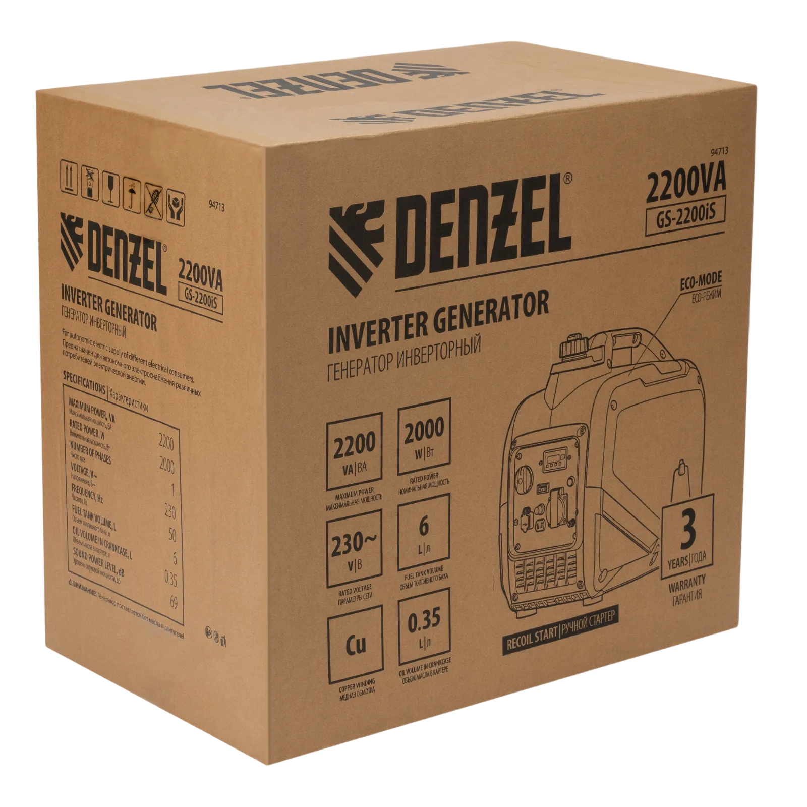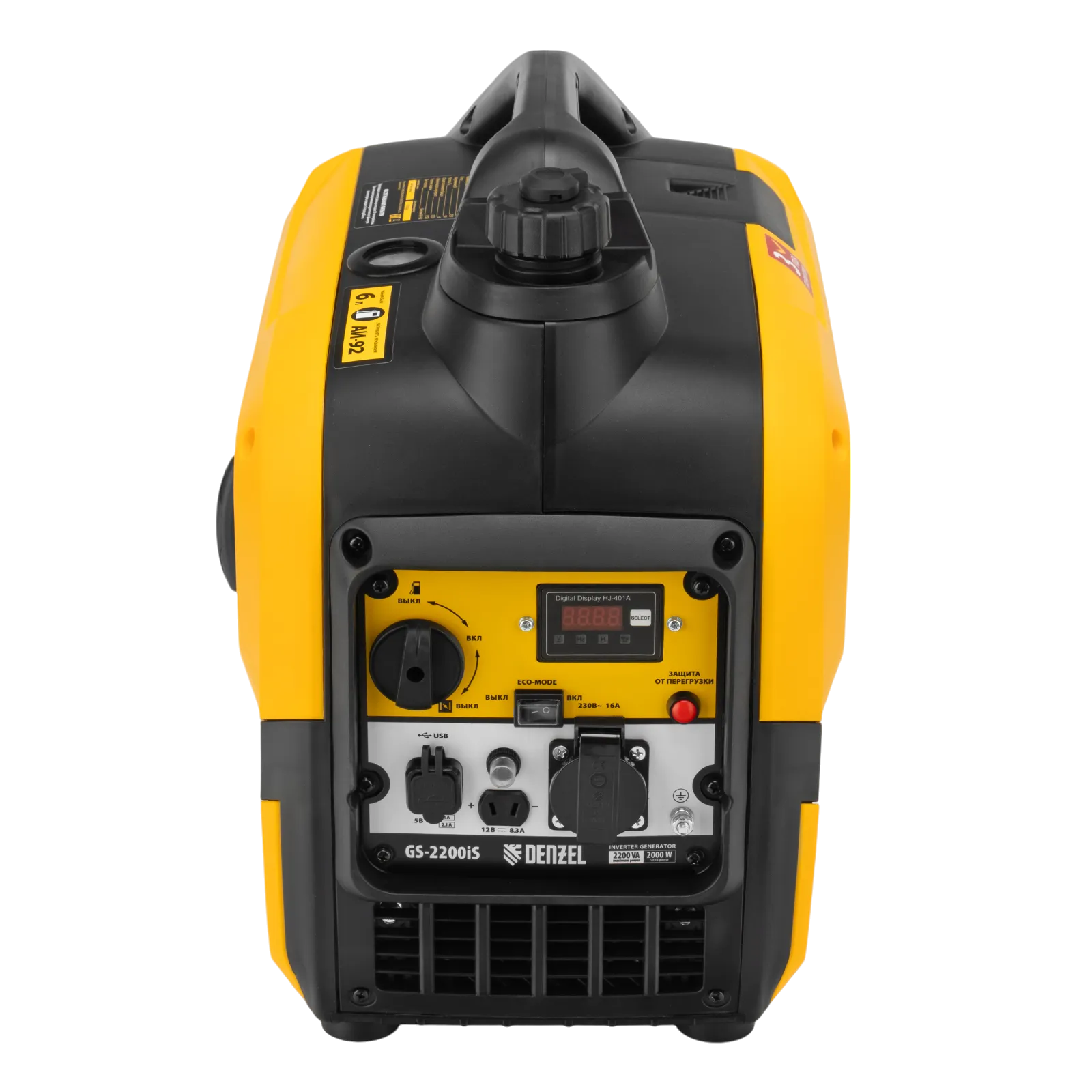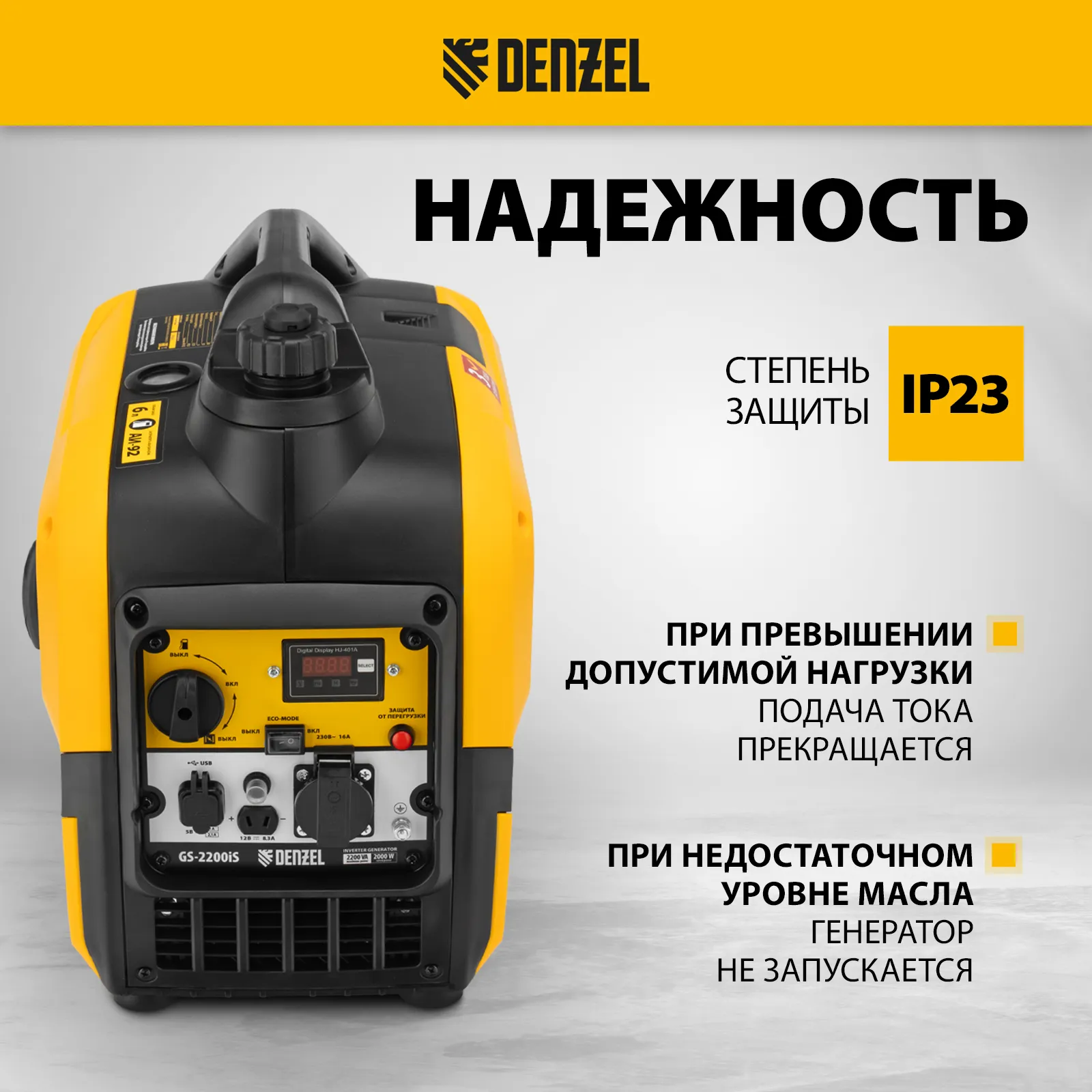 Инверторный генератор Denzel GS-2200iS 94713 максимальной мощностью 2,2 кВт, с ручным стартом, в закрытом корпусе, поддерживает напряжение 230 В и является автономным источником питания. Обеспечивает работу осветительных приборов, электроинструмента, бытовой техники в случае отсутствия подключения к электросети. Обеспечивает стабильный ток с неизменными параметрами и подходит для подключения высокоточной техники: компьютеров и т.д. Выход постоянного тока USB 5 В позволяет заряжать смартфоны, планшеты и другие гаджеты. Есть возможность зарядки автомобильных аккумуляторов — для этого предусмотрен выход 12 В. Генератор пригодится владельцам загородных домов.