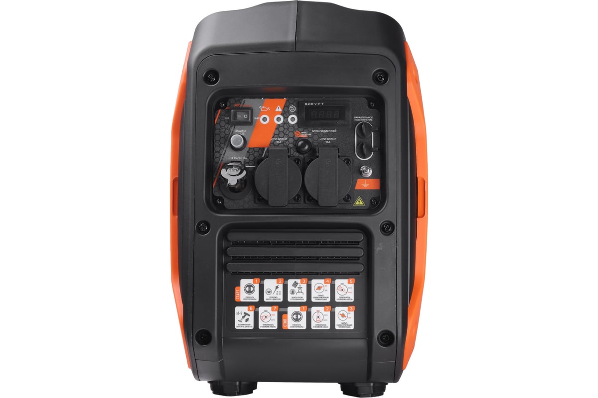 - Индикаторы на панели показывают параметры напряжения, превышение мощности генератора, низкий уровень масла