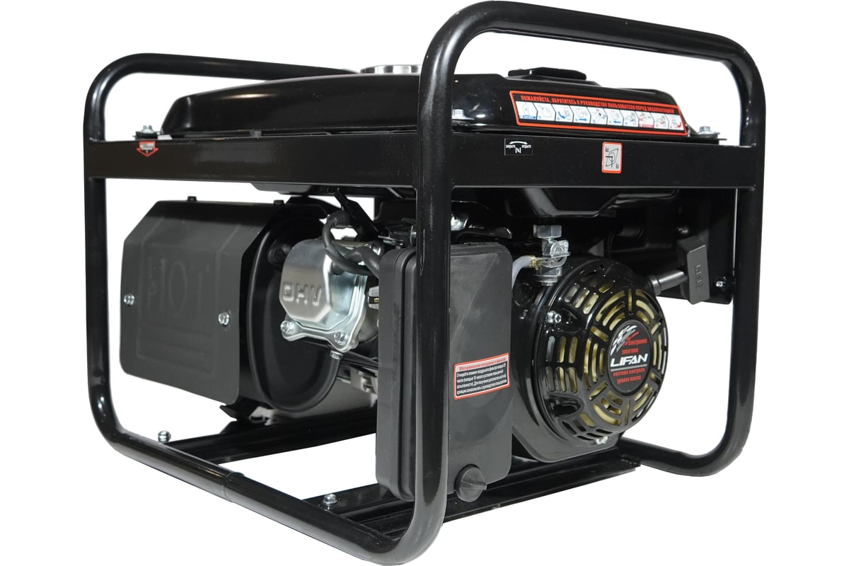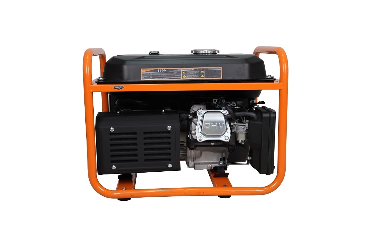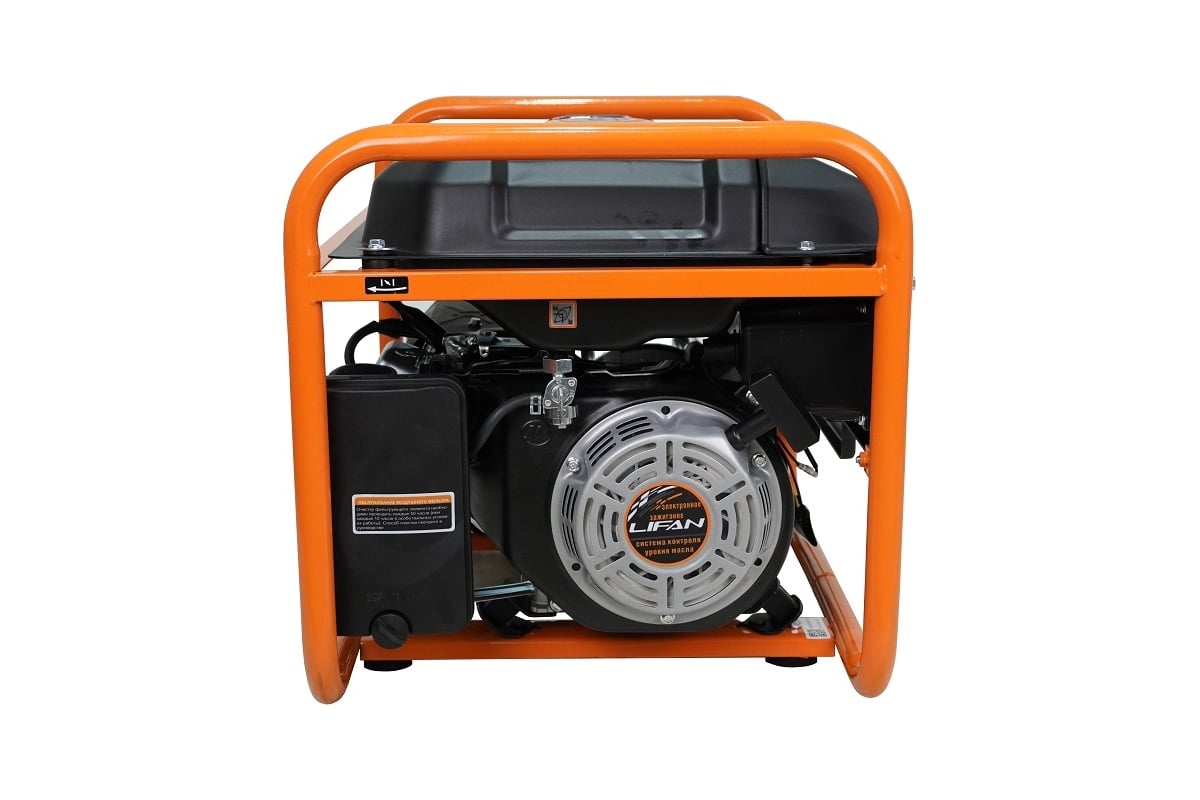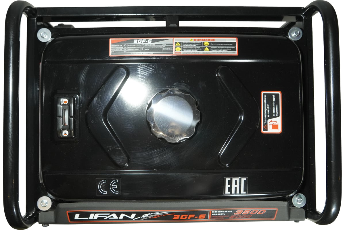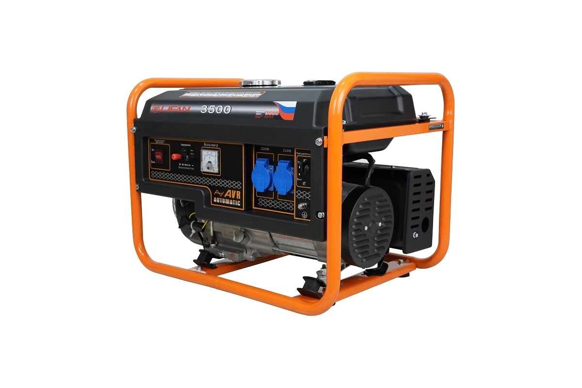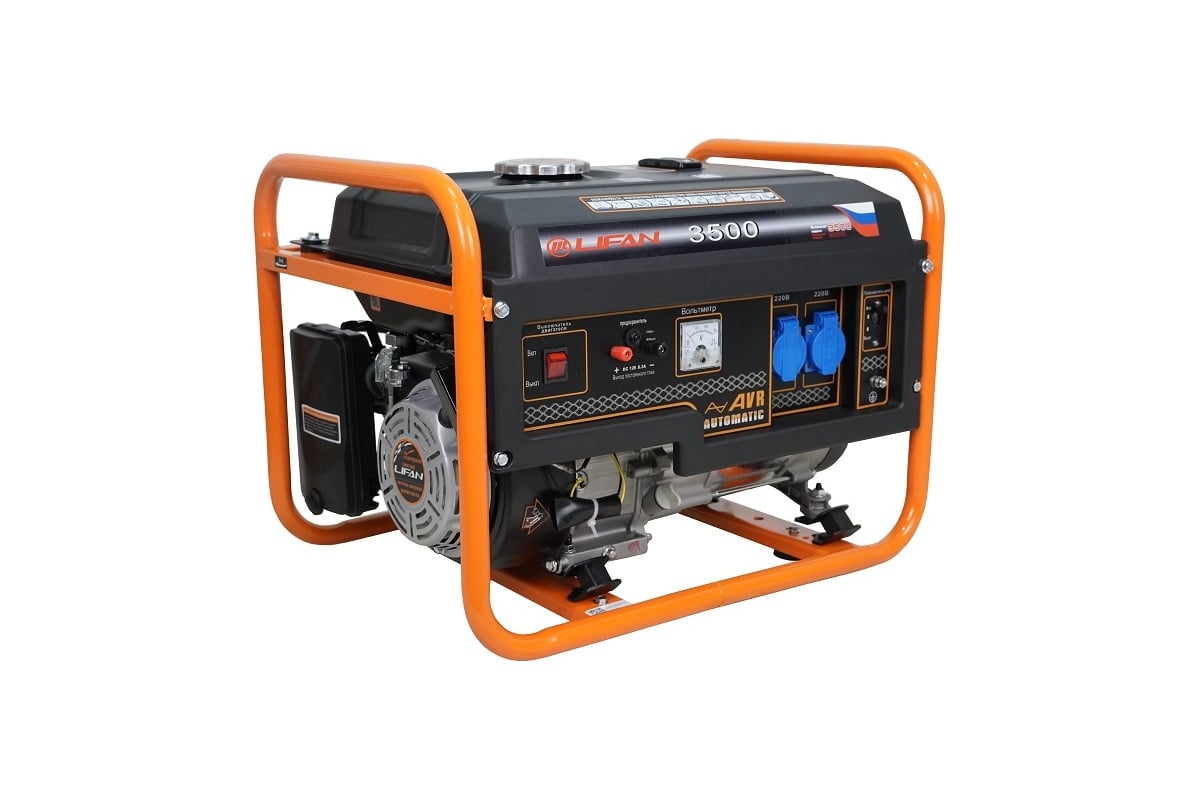 Бензиновый генератор LIFAN 3500 (3GF-6) - это новое поколение электрогенераторов, где в качестве силового агрегата установлен двигатель серии King Power KP230 мощностью 8.0 л.с. Компактные габариты двигателя, небольшой вес для такой мощности, стабильная работа обеспечат любые потребности в электроэнергии на даче, на природе и в условиях различных работ. Генератор рассчитан на 10 часов непрерывной работы, имеет мощность 3.0/3.5 кВт, что позволяет длительное время снабжать электричеством несколько энергоемких электроприборов. Специальные демпфирующие подушки, предусмотренные конструкцией LIFAN 3500 (3GF-6), позволяют устройству создавать меньше шума и вибрации. Удобная металлическая рама с рукоятками облегчает перенос и транспортировку генератора и обеспечивает его устойчивое положение на поверхности. На розетках имеются специальные крышки, защищающие от попадания твердых загрязнений и влаги. Как и все однофазные генераторы LIFAN, данная модель является "действительно однофазной" (одна "фаза" 220 Вольт и один "ноль") и имеет медную обмотку, позволяющую повысить КПД, уменьшить расход топлива, нагрев и износ агрегата, тем самым увеличивая срок его службы. Оснащена вольтметром, индикатором уровня топлива, системой контроля уровня масла и автоматического отключения в случае снижения его уровня, а также системой защиты от перегрузок (AVR).