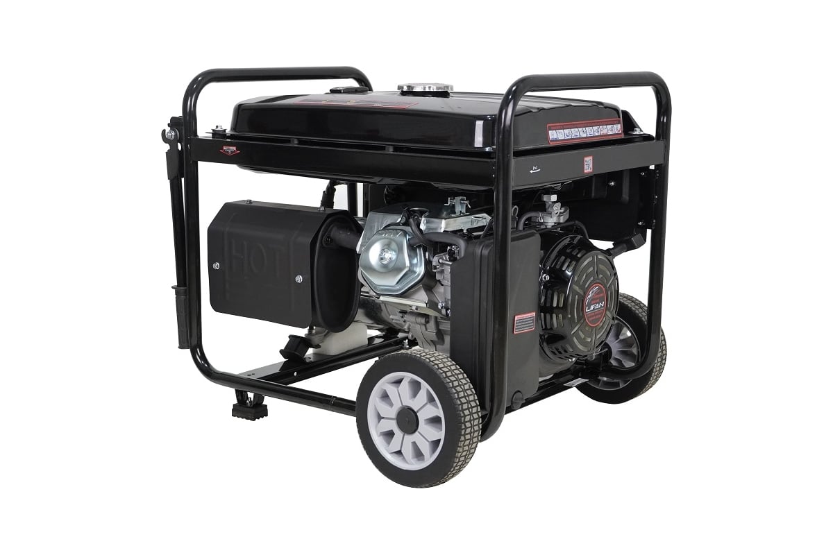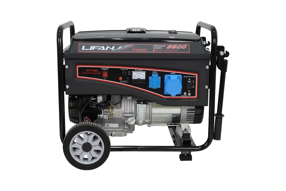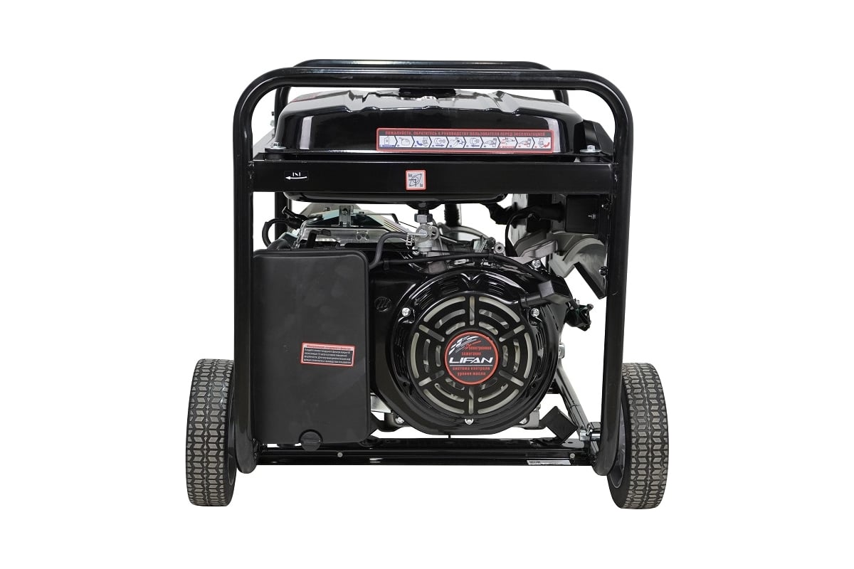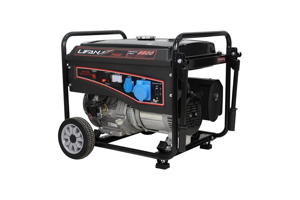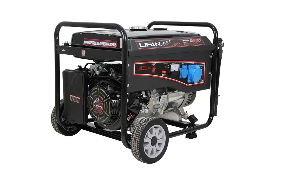 Электрогенератор, или просто генератор - устройство первой необходимости в ситуациях, когда требуется обеспечить работу электрической техники при отсутствии центрального электроснабжения или сбое в подаче электроэнергии. Сфера применения генераторов очень разнообразна и включает использование в качестве основного и резервного источника питания на загородных и городских участках, при проведении строительных, ремонтных и иных работ, в промышленных, офисных и домашних условиях, на социальных объектах, общественных мероприятиях, в походах, на пикниках и различных местах, где невозможен иной доступ к электричеству. Генераторы LIFAN компонуются двигателями собственного производства, изготавливаемыми по лицензии HONDA, которые заслуженно являются самыми продаваемыми двигателями на рынке. Бензиновый генератор LIFAN 7000 (6GF-3) - отличный мощный источник электроэнергии с широкой областью применения, от бытового использования на дачных участках, в качестве основного или резервного генератора, до применения в зонах ремонтных и строительных работ. Генератор обладает высокой мощностью в 6/6,5 кВт, благодаря чему способен обеспечивать питанием одновременно множество весьма энергоемких электроприборов, включая инструменты и рабочую электротехнику, на протяжении 6 часов непрерывной работы. Специальные демпфирующие подушки, предусмотренные конструкцией LIFAN 7000 (6GF-3), позволяют устройству создавать меньше шума и вибрации. Удобная металлическая рама с рукоятками облегчает перенос и транспортировку генератора и обеспечивает его устойчивое положение на поверхности. На розетках имеются специальные крышки, защищающие от попадания твердых загрязнений и влаги. Как и все однофазные генераторы LIFAN, данная модель является "действительно однофазной" (одна "фаза" 220 Вольт и один "ноль") и имеет медную обмотку, позволяющую повысить КПД, уменьшить расход топлива, нагрев и износ агрегата, тем самым увеличивая срок его службы. Оснащена вольтметром, индикатором уровня топлива, системой контроля уровня масла и автоматического отключения в случае снижения его уровня, а также системой защиты от перегрузок.