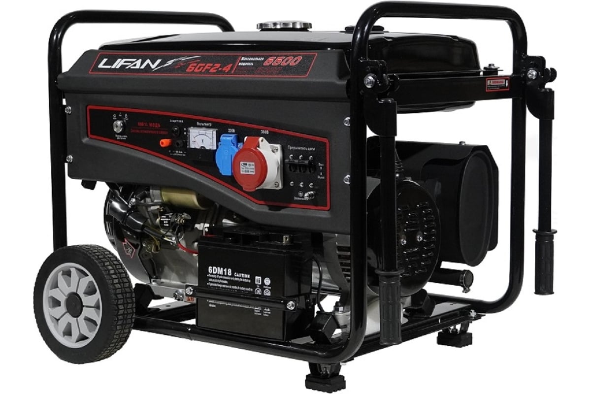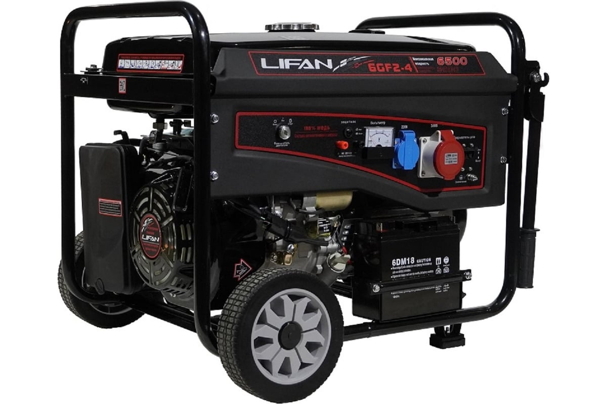 Электрогенератор, или просто генератор - устройство первой необходимости в ситуациях, когда требуется обеспечить работу электрической техники при отсутствии центрального электроснабжения или сбое в подаче электроэнергии. Сфера применения генераторов очень разнообразна и включает использование в качестве основного и резервного источника питания на загородных и городских участках, при проведении строительных, ремонтных и иных работ, в промышленных, офисных и домашних условиях, на социальных объектах, общественных мероприятиях, в походах, на пикниках и различных местах, где невозможен иной доступ к электричеству. Генераторы LIFAN компонуются двигателями собственного производства, изготавливаемыми по лицензии HONDA, которые заслуженно являются самыми продаваемыми двигателями на рынке. Трехфазный бензиновый генератор LIFAN 7000E3 (6GF2-4) - многоцелевой источник электроэнергии, находящий свое применение в обеспении питанием как обычных бытовых электроприборов, так и трехфазных потребителей электричества (например трехфазный насос, а также ремотная и строительная техника), обладающий мощностью в 6/6,5 кВт и временем непрерывной работы в 8 часов. Имеет выходное напряжение 220 и 380 В. Специальные демпфирующие подушки, предусмотренные конструкцией LIFAN 6GF2-4, позволяют устройству создавать меньше шума и вибрации. Удобная металлическая рама с рукоятками и колесами облегчает перенос и транспортировку генератора и обеспечивает его устойчивое положение на поверхности. На розетках имеются специальные крышки, защищающие от попадания твердых загрязнений и влаги. Генератор LIFAN 7000E3 (6GF2-4) оснащен электрическим стартером, делающим запуск легким и удобным - достаточно простого поворота ключа. В комплекте с генератором поставляется аккумулятор. Генератор оснащен вольтметром, индикатором уровня топлива, системой контроля уровня масла и автоматического отключения в случае снижения его уровня, а также системой защиты от перегрузок. Медная обмотка позволяет повысить КПД, уменьшить расход топлива, нагрев и износ агрегата, тем самым увеличивая срок его службы.