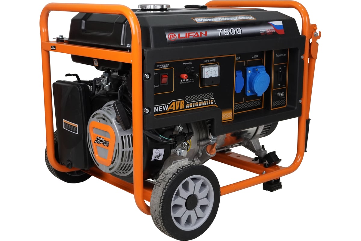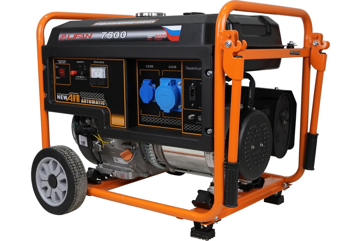 Генератор LIFAN 7 GF-6 (7500) используется для обеспечения потребителей электроэнергией на территориях, где нет подключения к централизованным сетям или при её отключении. Надежный двигатель обеспечивает стабильную и бесперебойную работу на протяжении всего срока службы агрегата. Вместительный топливный бак позволяет работать генератору продолжительное время без дозаправки. Рамная конструкция служит каркасом для установки рабочих узлов и позволяет перемещать аппарат по территории. Помимо розеток на 220В, есть выход на 12 В для подзарядки АКБ автомобиля. Отличный вариант для использования на небольших СТО, в гараже или на даче. Особенности: Стабильное и высокое качество тока; Запуск как от ручного, так и от электростартера; Вместительные топливный бак; Низкий уровень шума; Увеличенный моторесурс; Простая конструкция упрощает обслуживание; Розетки имеют защитные крышки; Медная обмотка альтернатора; Низкий уровень шума; Защита от перегрузки; Антивибрационная система позволяет снизить вибрацию и повысить устойчивость аппарата; Транспортировочный комплект помогает перемещать агрегат по территории; Прочная рамная конструкция предотвращает механические повреждения и обеспечивает устойчивость на поверхности. Комплектация: Колеса.