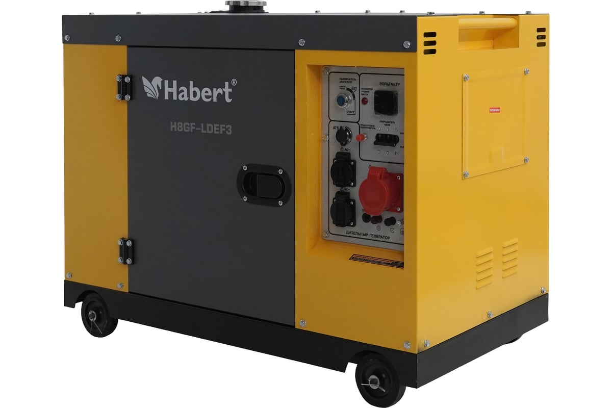 Habert Генератор Diesel H8GF-ME-F3 Технические характеристики Двигатель: LT195FD, 4-х тактный одноцилиндровый Мощность применяемого двигателя, л.с.: 14 Система запуска: Электрический и ручной старт Номинальная мощность генератора, КВт: 7 Максимальная мощность генератора, КВт: 7,5 Емкость топливного бака: 15 Расход топлива, л/ ч: 2,5 Время непрерывной работы, часов: 6 Выходное напряжение: 220 В Выходная частота: 50 Гц Уровень шума, дБ: 86,6 Габаритные размеры, мм: 770х535х610 Наличие розеток: 1х8.3А 12В, 1х16А 220В, 1х32А 220В Количество фаз: Одна фаза Наличие АКБ: Да Наличие колес: Да Наличие ручек: Да Степень защиты: розеток-IP44 Размеры упаковки, мм: 770х535х610 AVR (автоматический регулятор напряжения): AVR компаундного типа Рабочий объем двигателя, см3: 531 Вес(брутто), кг: 127 ATS (автоматический ввод резерва): отсутствует Объем масла в двигателе, л: 1,65 Тип генератора: Классический Бензин/Дизель: Дизель Вес (нетто), кг: 118,7