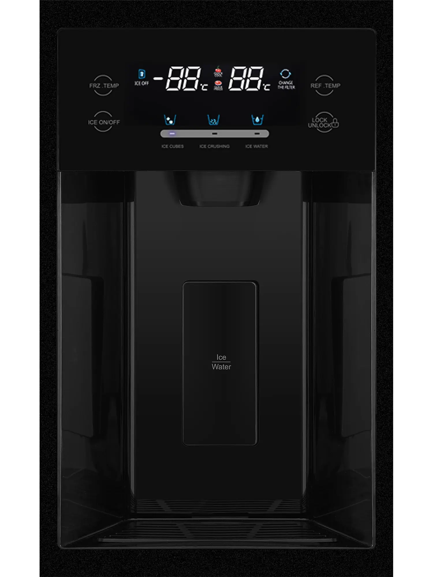 Главная особенность холодильника – автоматический ледогенератор с прямым подключением к водопроводу. Наличие диспенсера со съемным фильтром позволяет выдавать совершенно чистую холодную воду, кубики льда или ледяную крошку. Фильтр подлежит замене по мере необходимости.