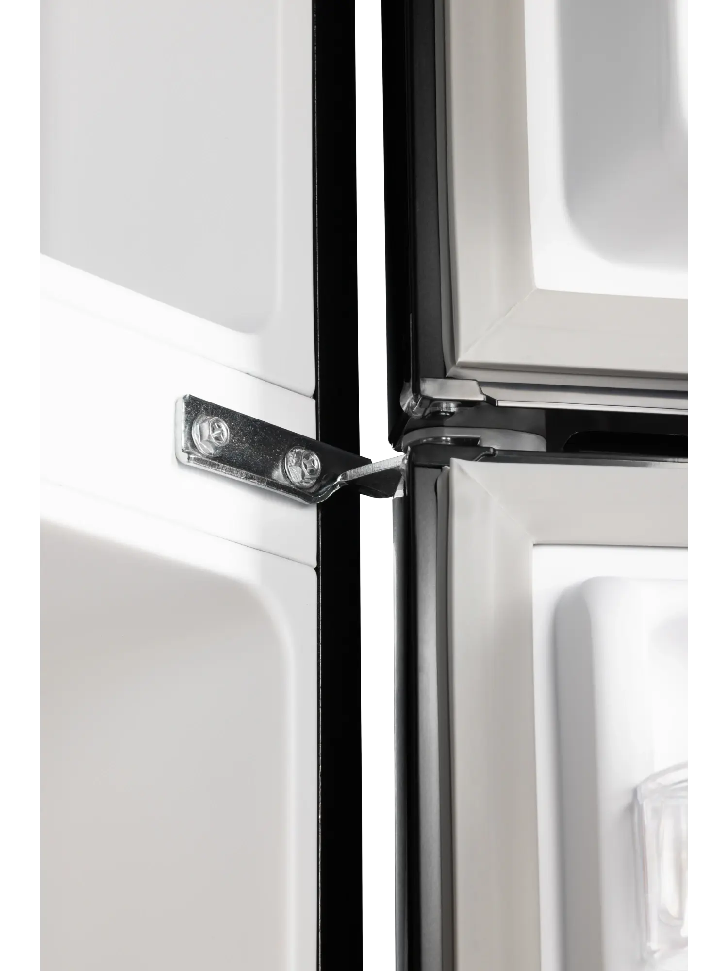 Корпус выполнен в стильном матовом черном цвете. Интегрированная горизонтальная ручка, дополненная декоративным серебристым элементом, подчеркивает лаконичный внешний вид модели. Благодаря возможности перенавешивания дверей, холодильник легко адаптируется к планировке помещения.