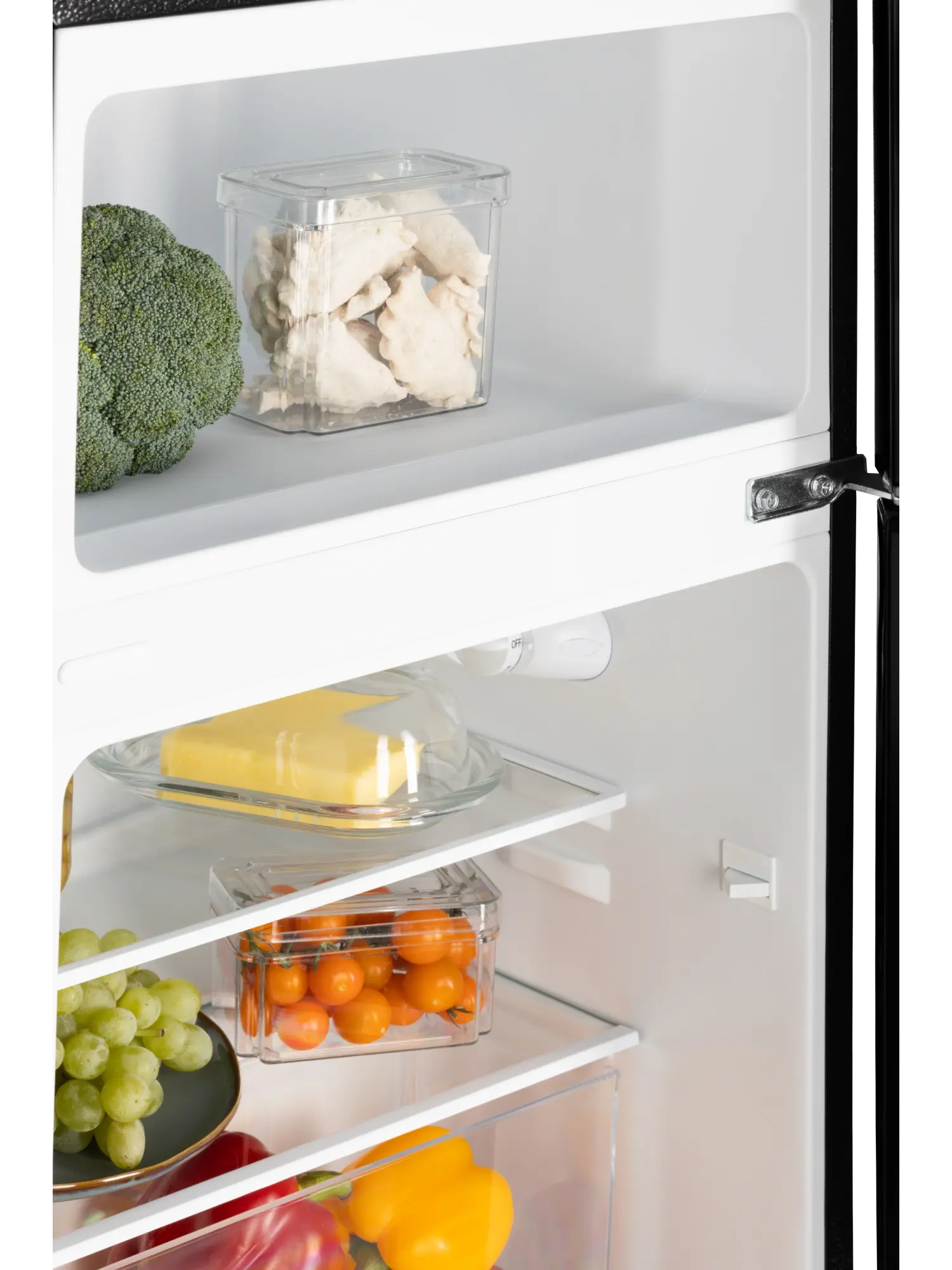 - 2 дверные полки подойдут для размещения молочных продуктов, напитков и упаковок;