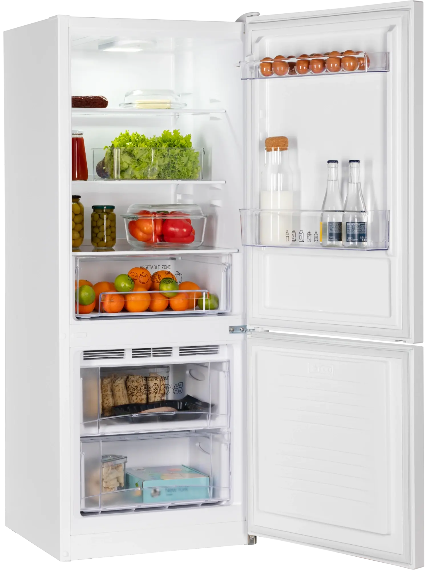 Двухкамерный отдельностоящий холодильник Nord FRB 721 W с нижним расположением морозильной камеры имеет общий объем 240 л.