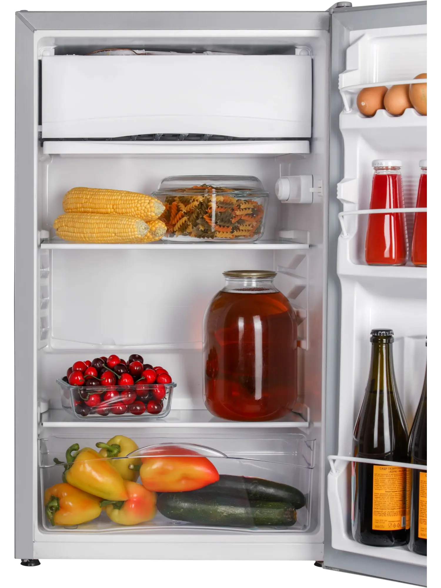 Дверь с интегрированной горизонтальной ручкой имеет возможность перенавешивания на другую сторону для комфортного открывания и установки модели в удобном месте. Корпус холодильника выполнен в серебристом цвете.